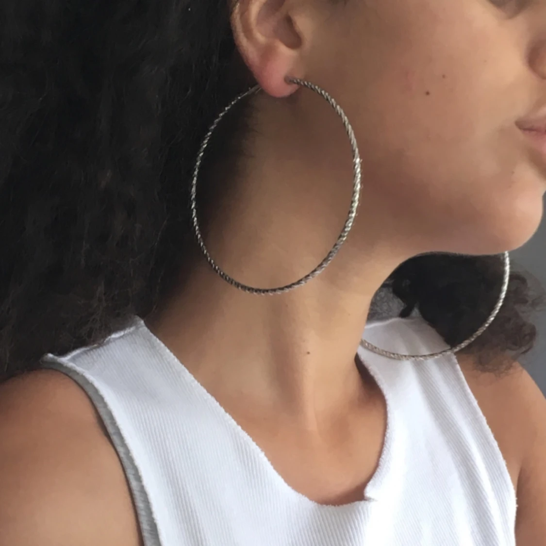 Stora silvriga hoops med ”textur”. Nyskick. Tvättar alla mina smycken med bakteriedödande innan jag packar dem.