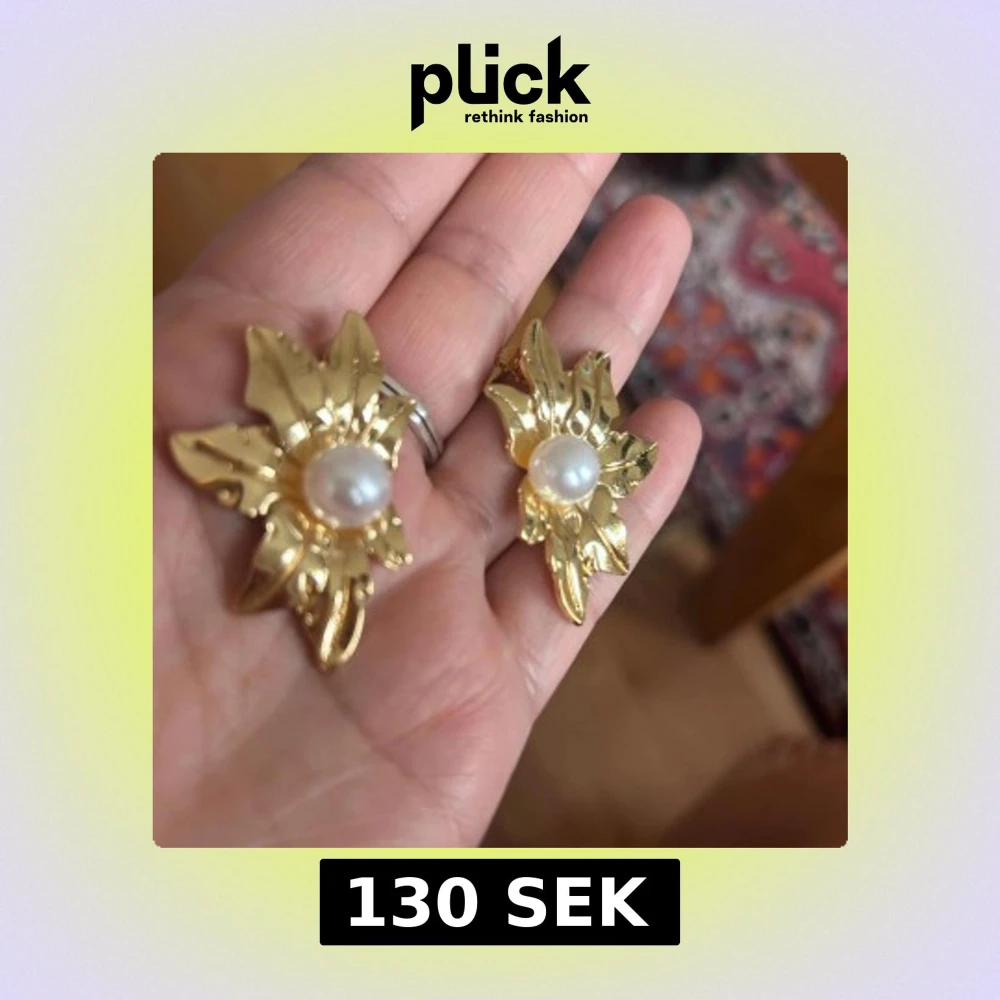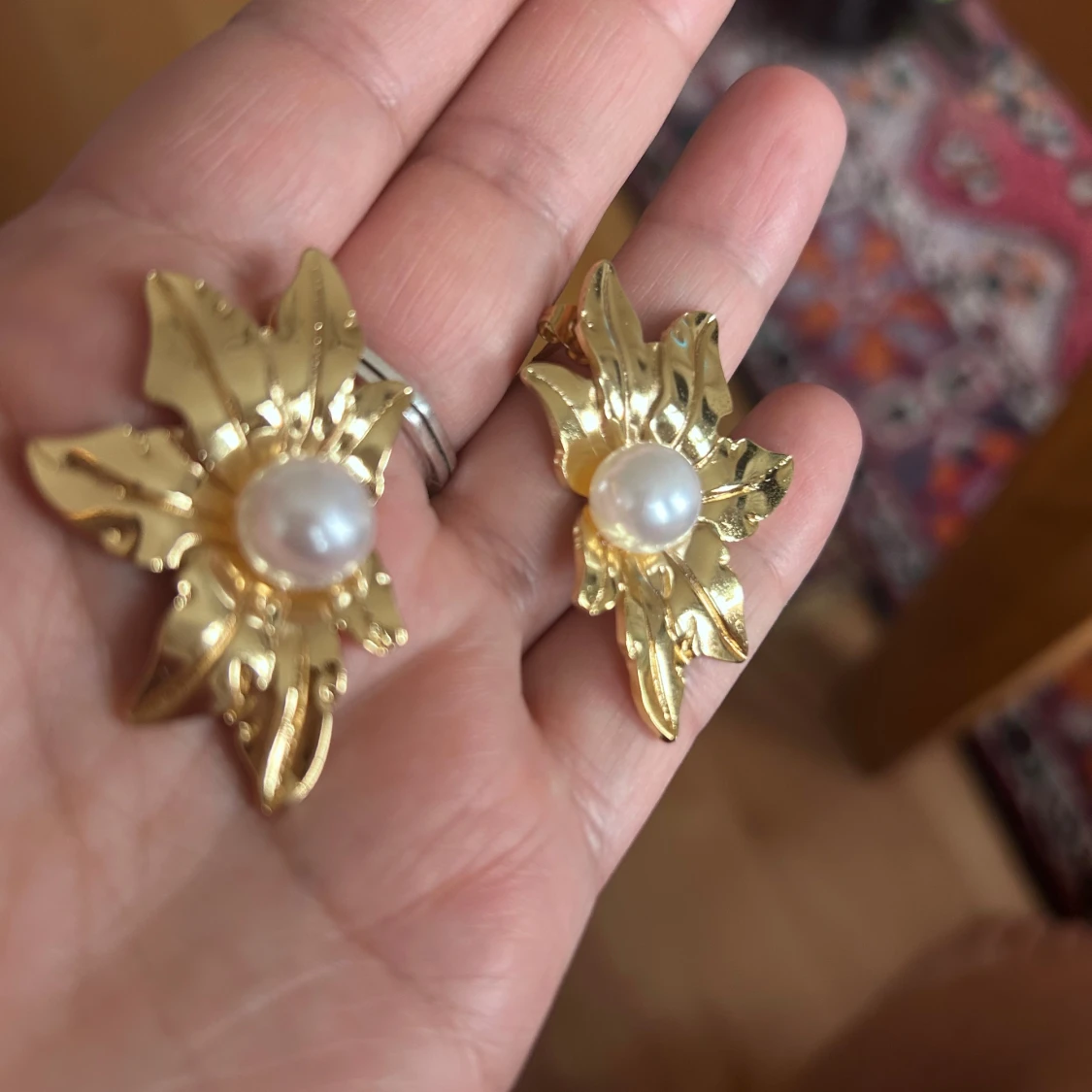 Unika örhängen i form av blommor med guldig metall och en vit pärla i mitten. De har en snygg, glansig finish och ger en lyxig känsla till din stil. Perfekta för dig som vill sticka ut med något extra.