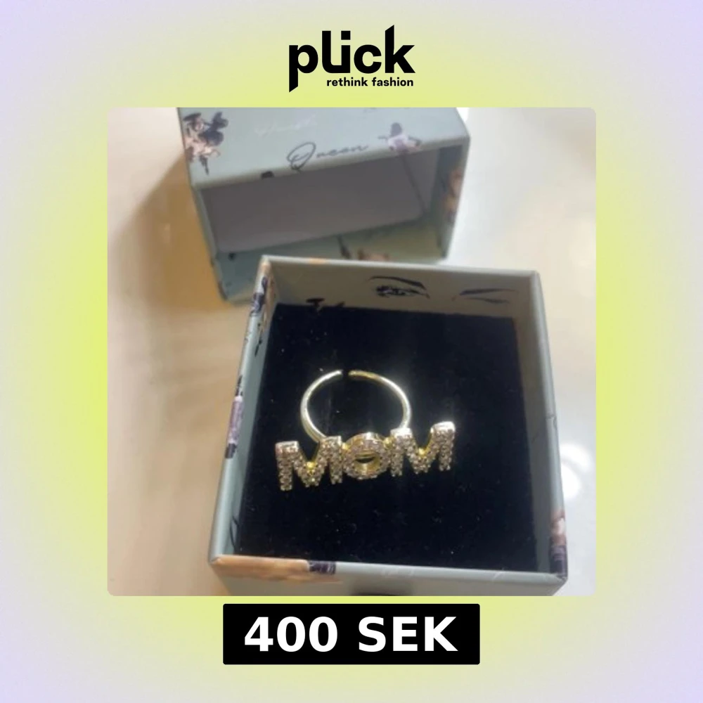 Trendig guldfärgad ring med texten 'MOM' dekorerad med glittrande stenar. Levereras i en fin ask. Ny pris 599 säljer för 400 och den är ny
