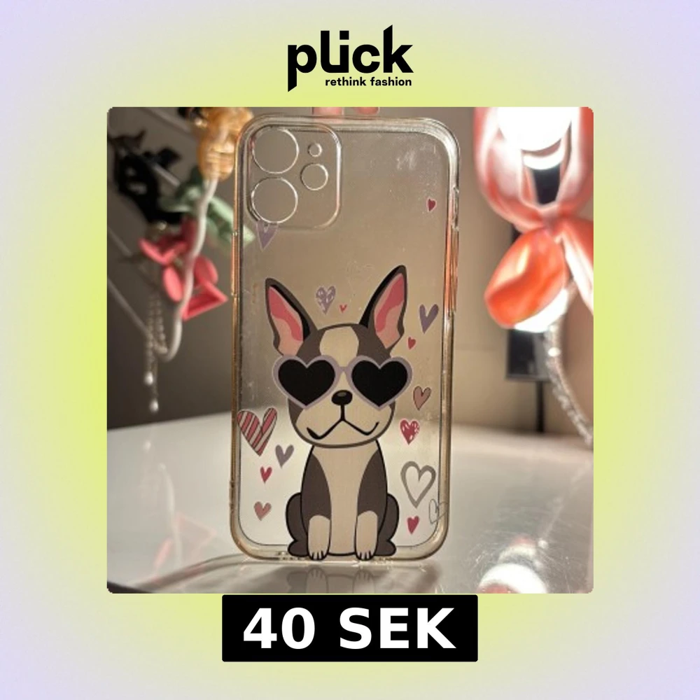 Säljer ett genomskinligt mobilskal med ett sött hundmotiv som har hjärtformade solglasögon. Skalet är dekorerat med små hjärtan i olika färger runt hunden. Perfekt för att ge din mobil en personlig och lekfull touch!