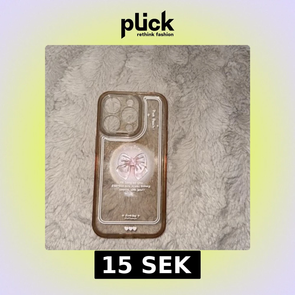 Sött genomskinligt skal till iPhone 14 Pro med rosa rosett och text. Skalets skick är använt, med viss missfärgning och repor, men motivet är intakt. Skyddar din mobil och ger en unik, feminin look. Passar perfekt för dig som vill ha ett personligt och stilrent skydd.