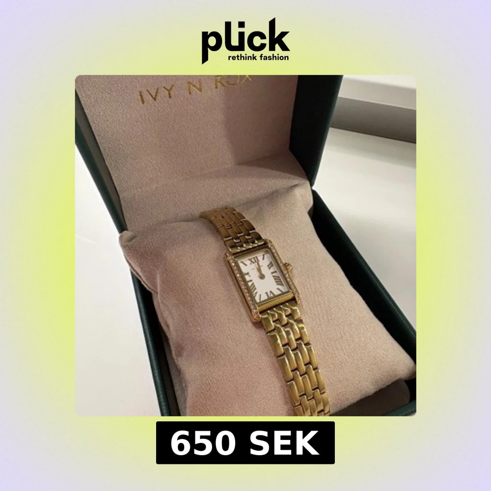 Elegant guldfärgad klocka från Ivy N Rox med rektangulär urtavla och romerska siffror. Armbandet är i metall med en klassisk länkdesign. Perfekt för en stilren look.