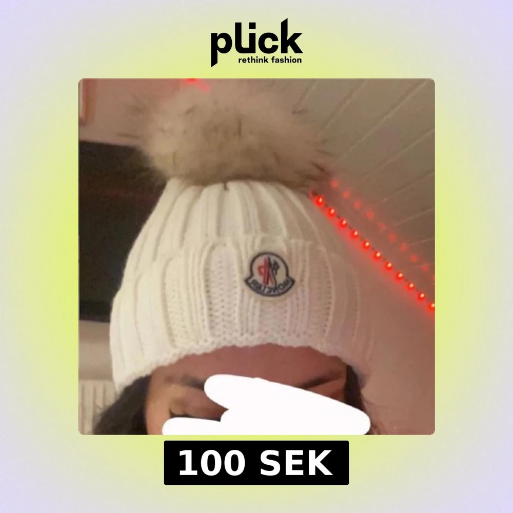 Vit ribbstickad mössa från Moncler med stor fluffig pälsboll på toppen. Mössan har Moncler-logga framtill och är tillverkad i ett mjukt, stickat material. Perfekt accessoar för kalla dagar och ger en lyxig vinterlook.