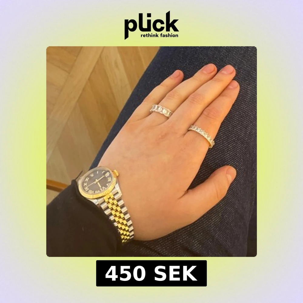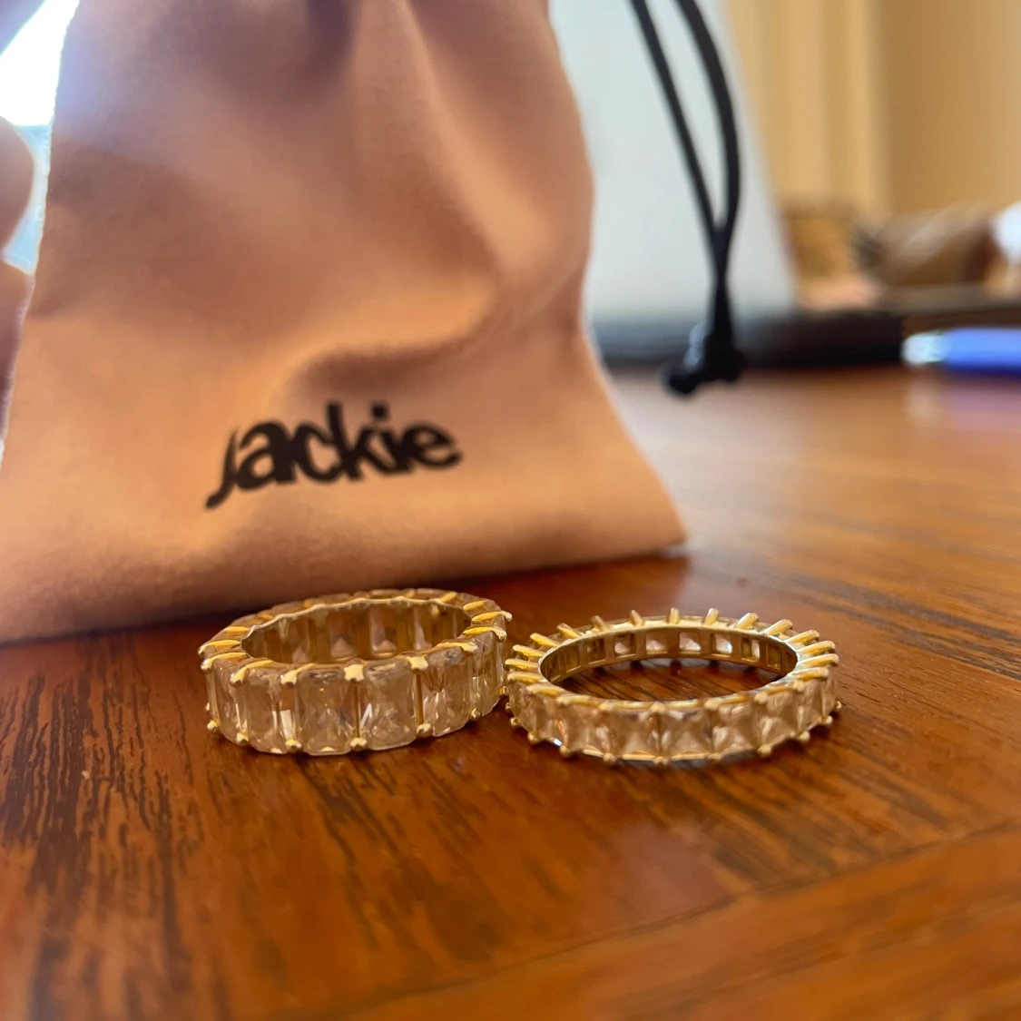 Två eleganta guldfärgade ringar från Jackie, dekorerade med gnistrande stenar runt om. Kommer i en fin påse med Jackies logotyp. Säljer dem antingen separat (250 kr per ring) eller båda tillsammans för 450 kr. ❤️