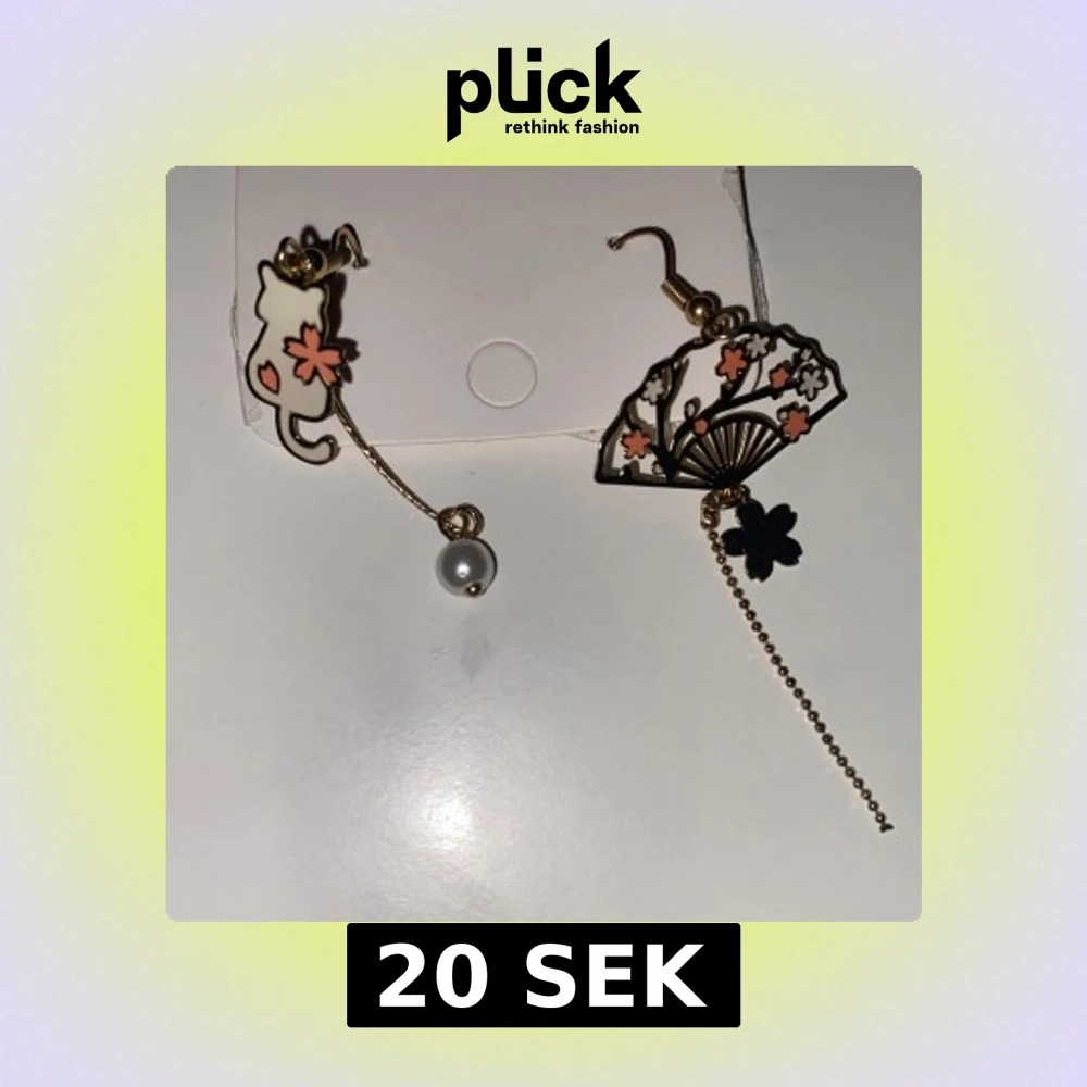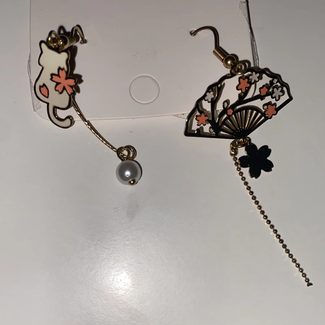Säljer ett par unika örhängen i guld med motiv av en katt och en solfjäder, dekorerade med rosa och svarta blommor samt en vit pärla. Ena örhänget har en kedja med svart blomdetalj. Perfekt för dig som gillar söta accessoarer med japansk touch.