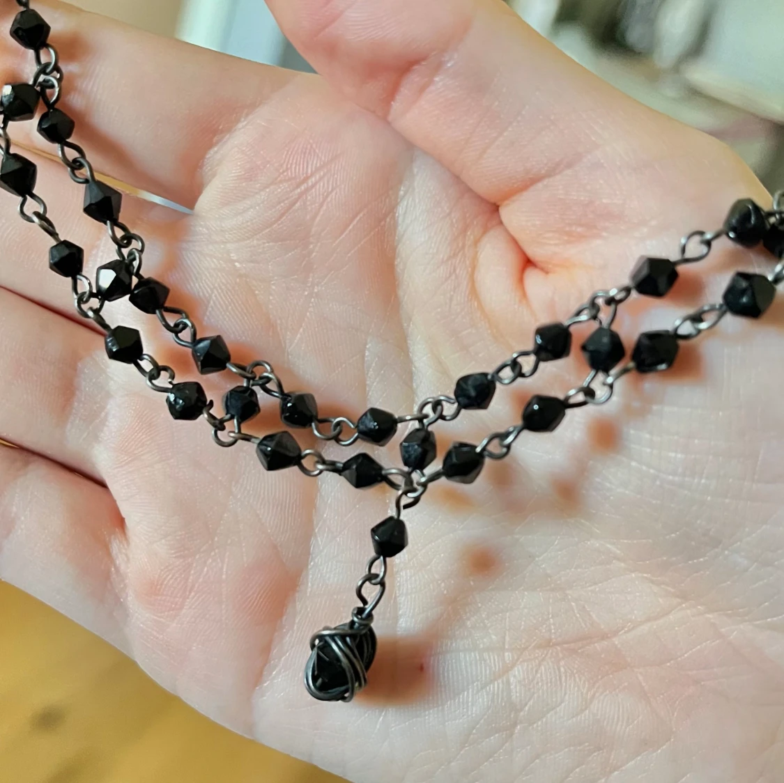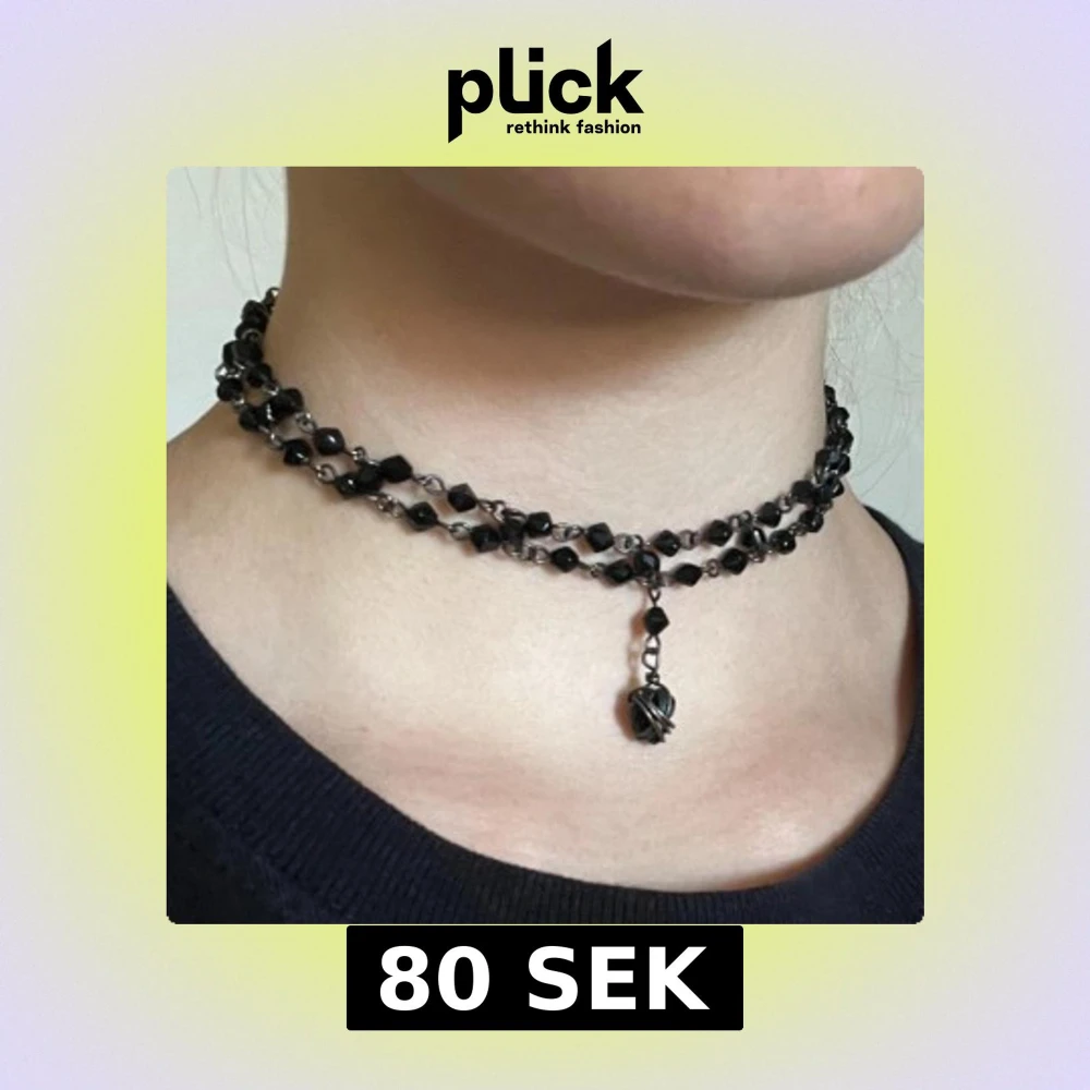Coolt svart choker-halsband med dubbla rader av facetterade pärlor och en hängande pärla i metalltråd. Kedjan är mörk och ger en edgy vibe, perfekt för att lyfta din stil. Snygg detalj med den lilla pärlan som hänger i mitten.