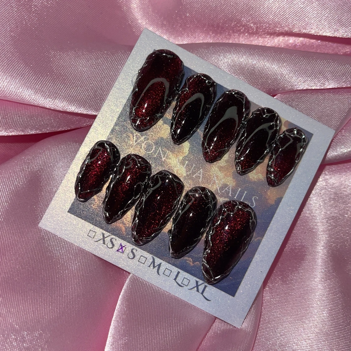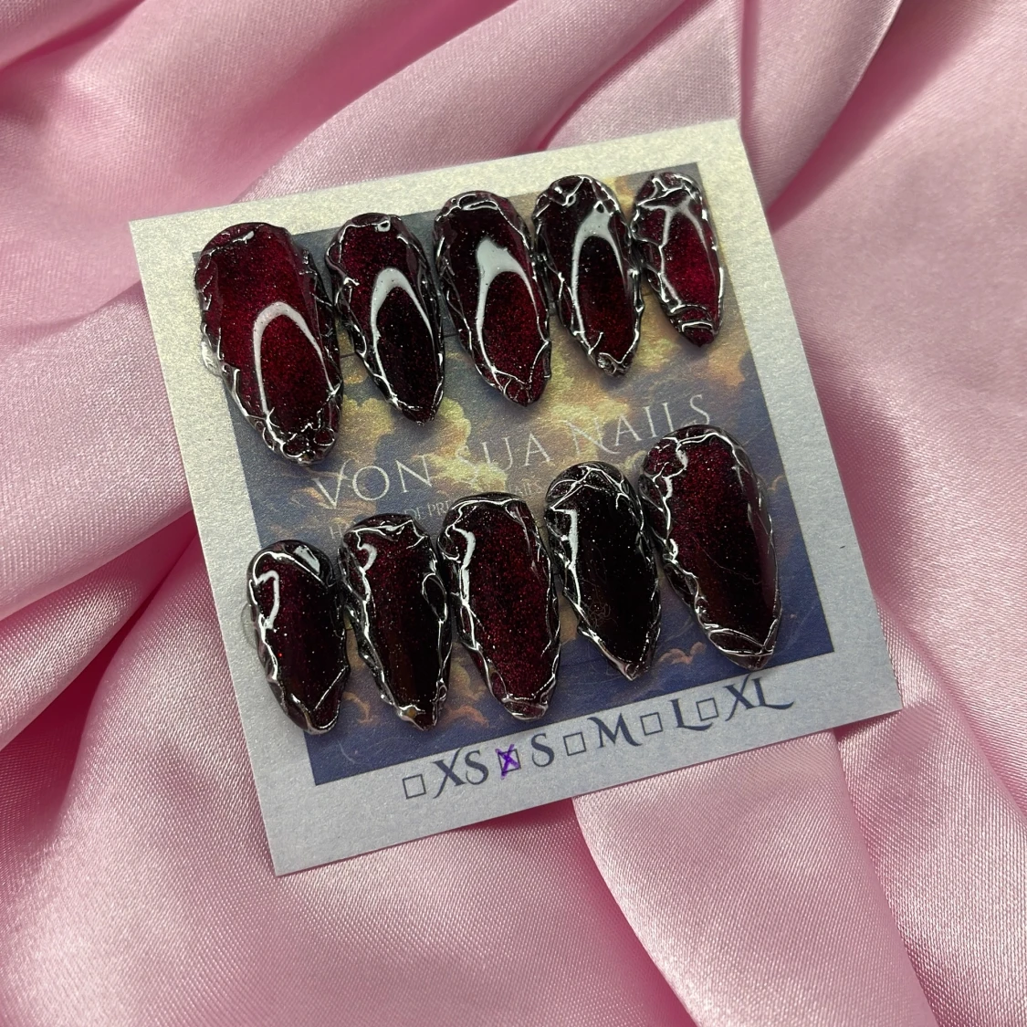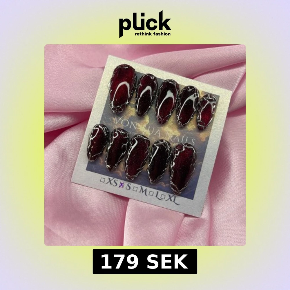 Säljer ett set med konstnaglar i vinrött med vinröd cateye finish och coola 3D handmålade silverdetaljer längs kanterna. Naglarna har en medium almond form och kommer i S: 15 mm, 11,5 mm, 12 mm, 11 mm, 9 mm . Perfekt för dig som vill ha en edgy och unik look.