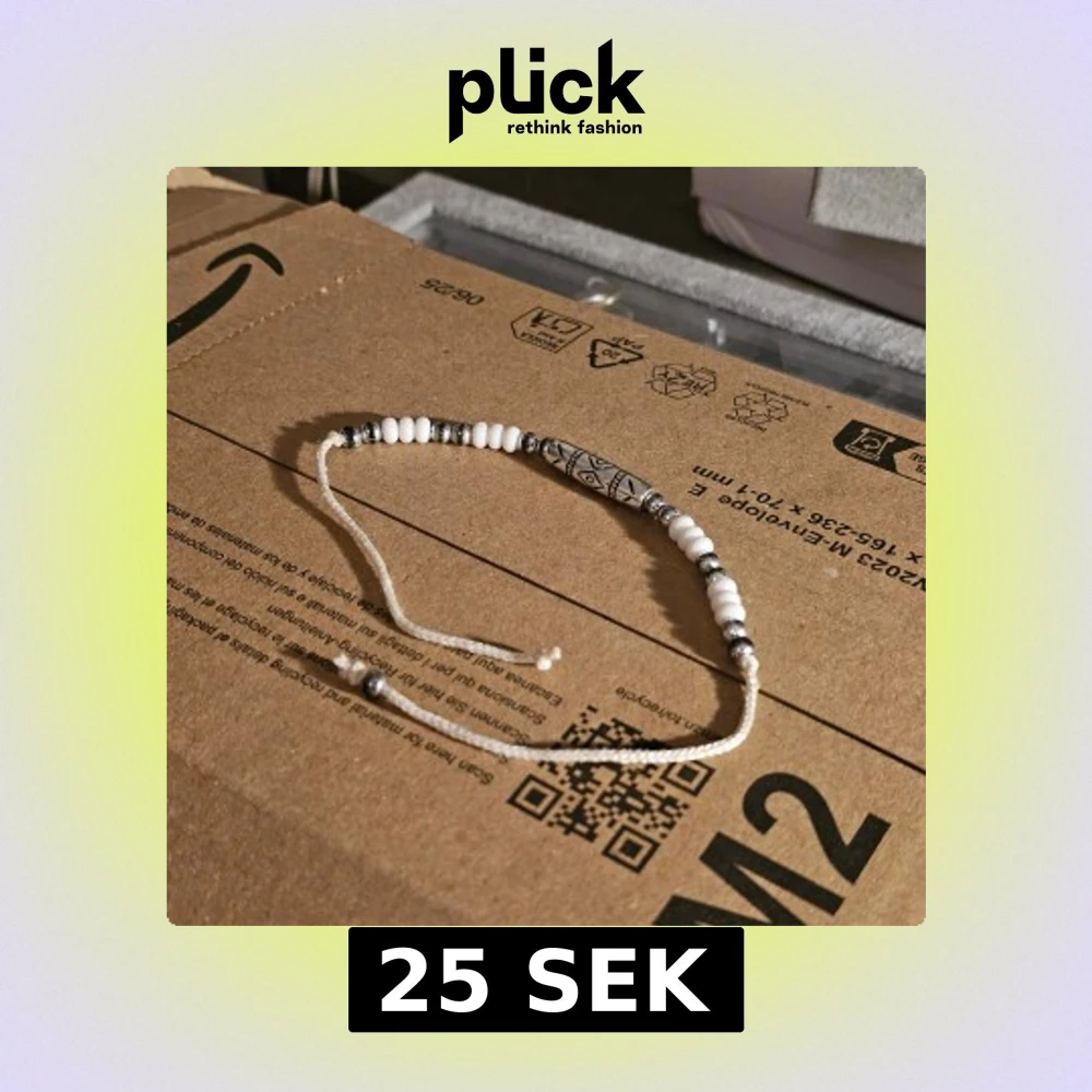 Säljer ett vitt armband med små pärlor och en större mönstrad pärla i mitten. Armbandet har justerbar knytning och inslag av gråa detaljer. Perfekt accessoar för en stilren look.