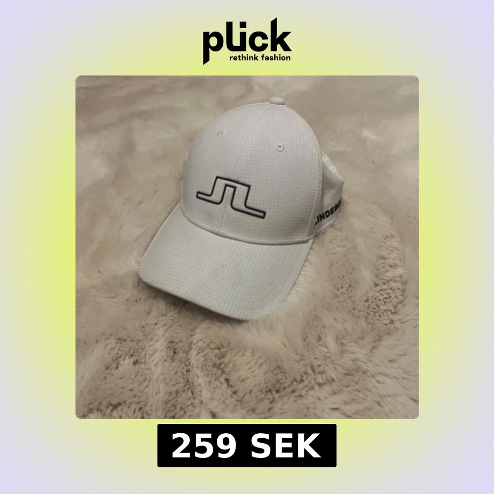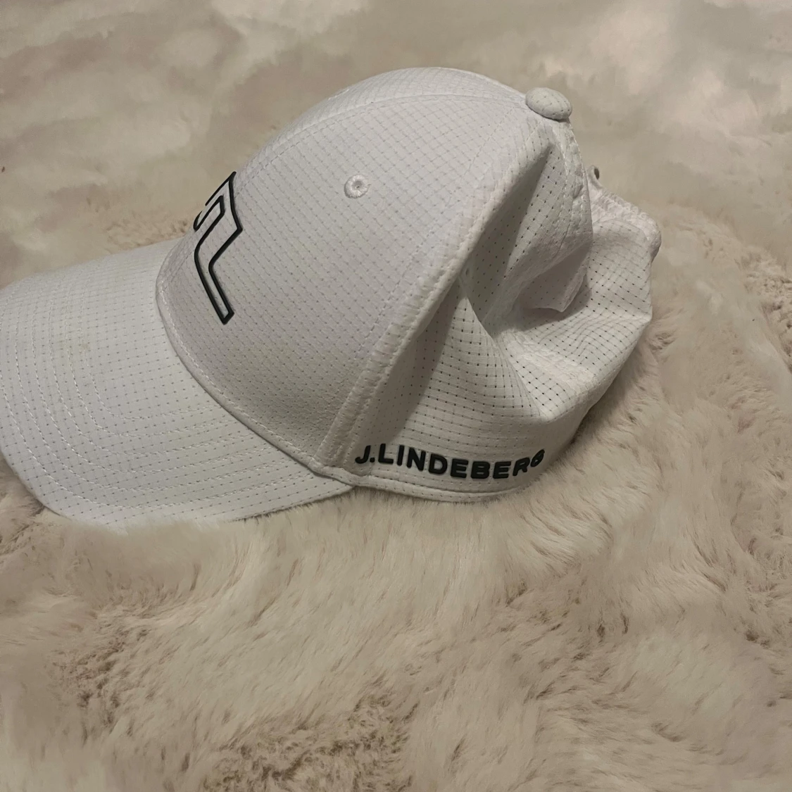 Snygg vit (golf)/keps från J.Lindeberg med svart logotyp framtill och diskret rutmönster i materialet. Kepsen har böjd skärm och justerbar baksida.