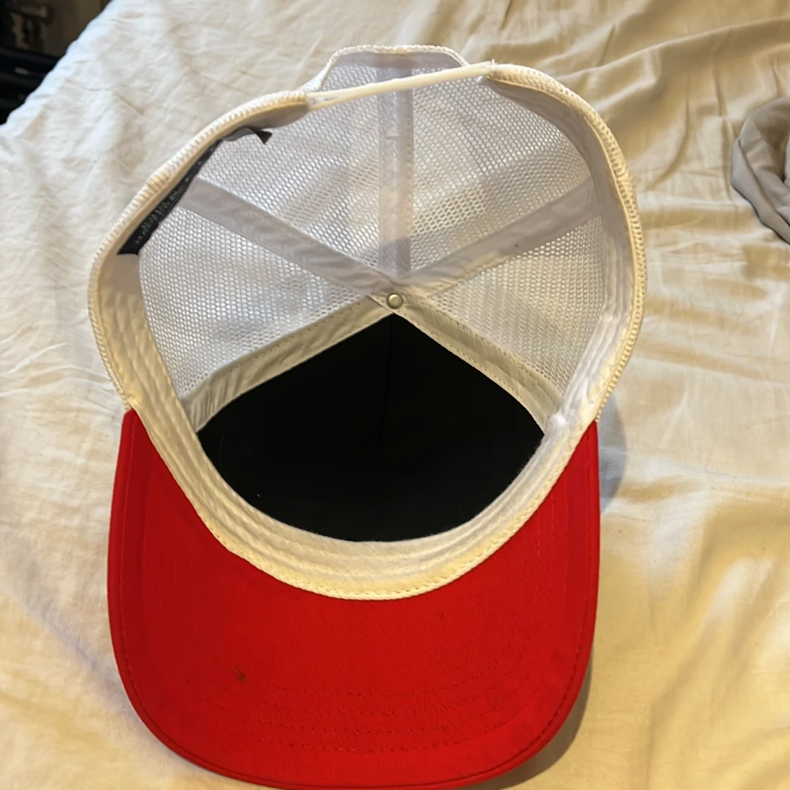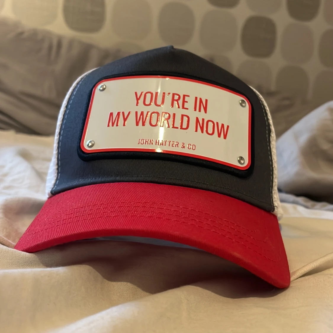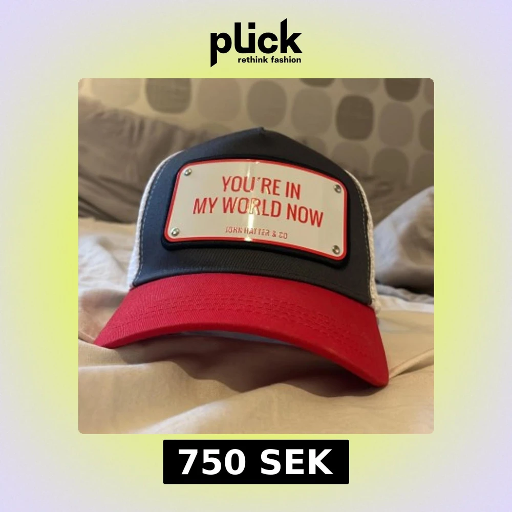 Snygg truckerkeps från John Hatter & Co med röd böjd skärm, vit mesh på sidor och bak samt mörkgrå front. Metallskylt med texten 'YOU'RE IN MY WORLD NOW' framtill. Justerbar snapback och cool streetstil. Perfekt för att sticka ut.