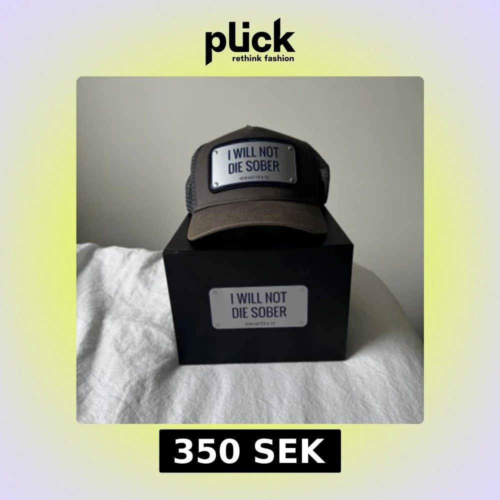 Cool grå keps med justerbar baksida och meshpaneler. Framtill sitter en metallskylt med texten 'I WILL NOT DIE SOBER'. Perfekt statement-piece för dig som vill sticka ut. Hör av er vid funderingar ✅