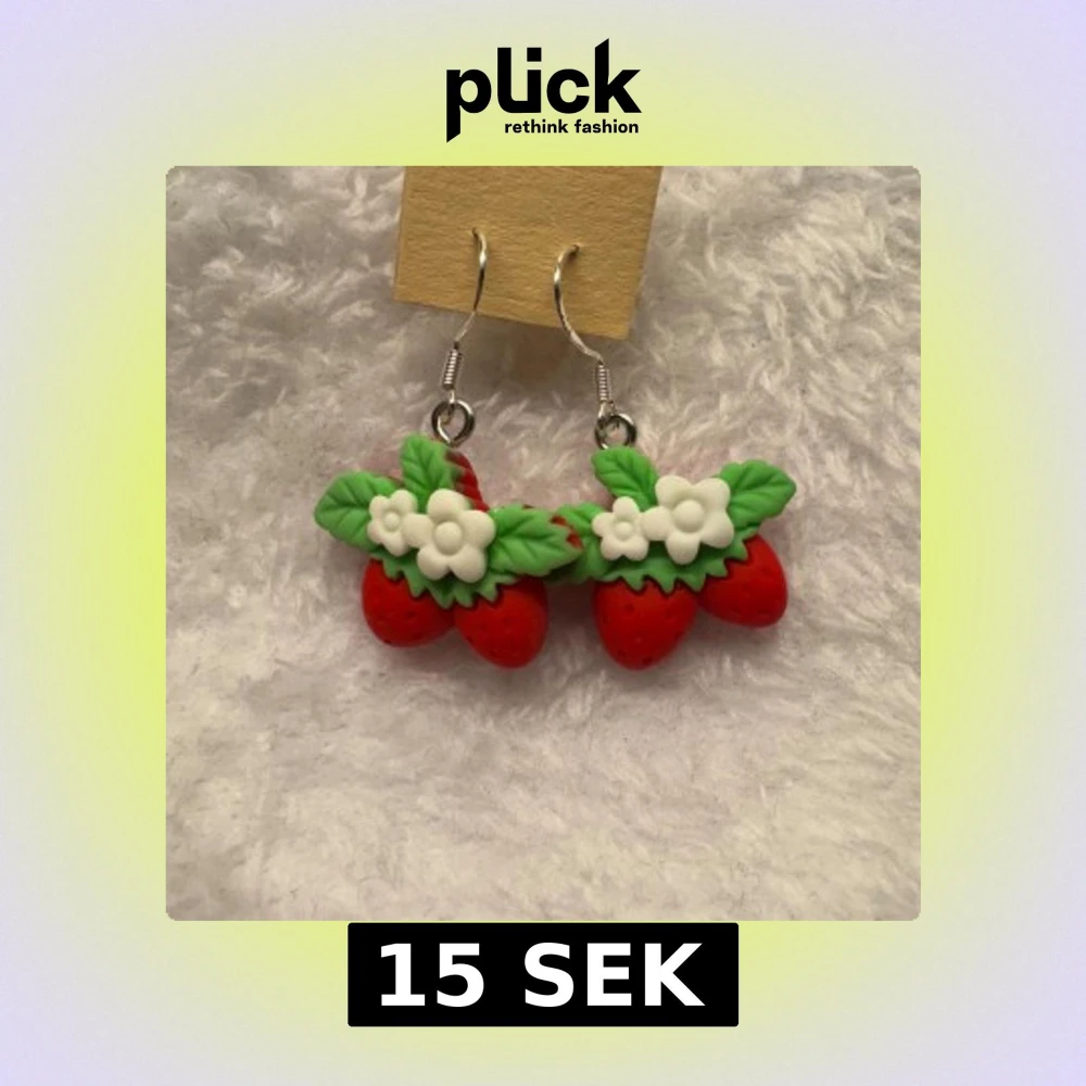 Säljer ett par söta örhängen formade som jordgubbar med gröna blad och vita blommor. Perfekta för dig som vill ha något färgglatt och lekfullt till din stil!