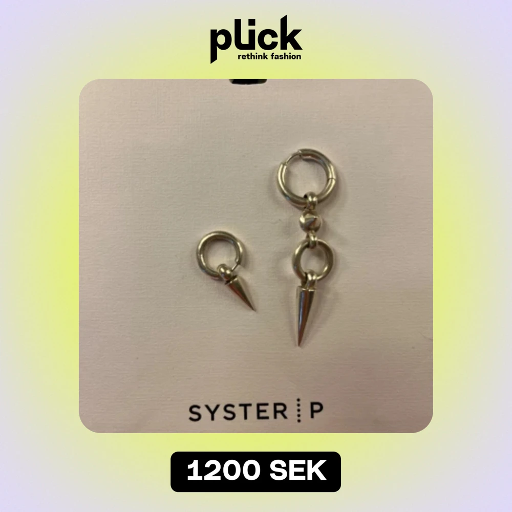 Syster P örhängen i bra skick, silver. Nypris lilla örhänget : 499 kr Nypris stora örhänget : 1199 kr Kan köpas tillsammans eller separat (350 kr lilla, 850 kr stora, 1200 kr tillsammans) De ser lite gula ut på bilden vilket de inte är egentligen