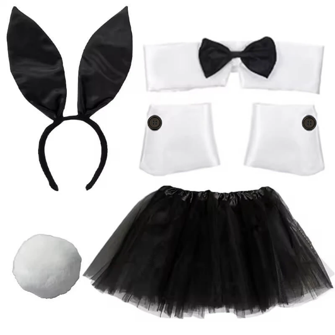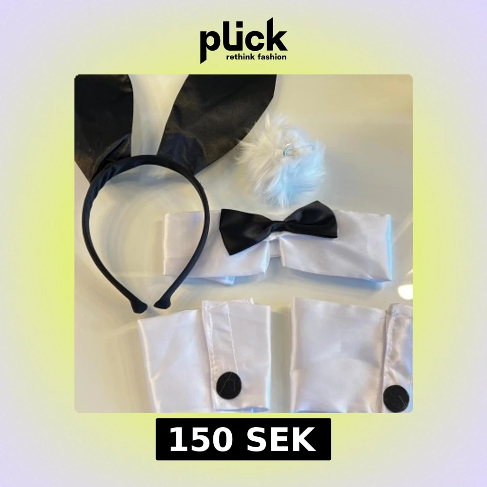 Playgirl Bunny set, perfekt för halloween! Snyggt diadem med stora svarta kaninöron. Setet inkluderar även vit fluffig svans, vit krage med svart fluga och matchande manschetter. Aldrig använt