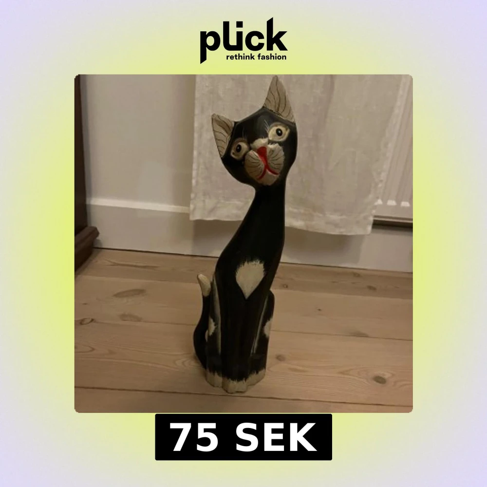Charmig träskulptur föreställande en svart katt med vita detaljer. Katten har en elegant och stiliserad form med ett uttrycksfullt ansikte. Perfekt som dekoration i hemmet för kattälskare. Höjd 41 cm. Har totalt 4 st i olika storlekar