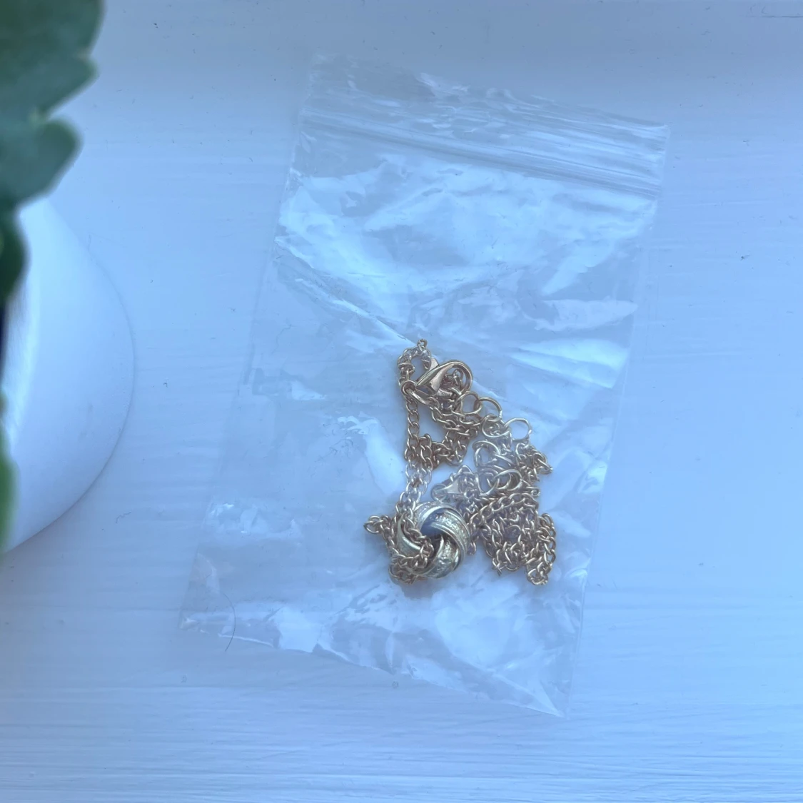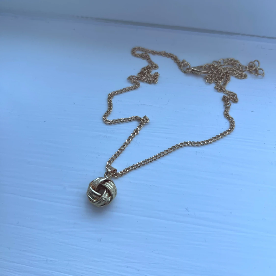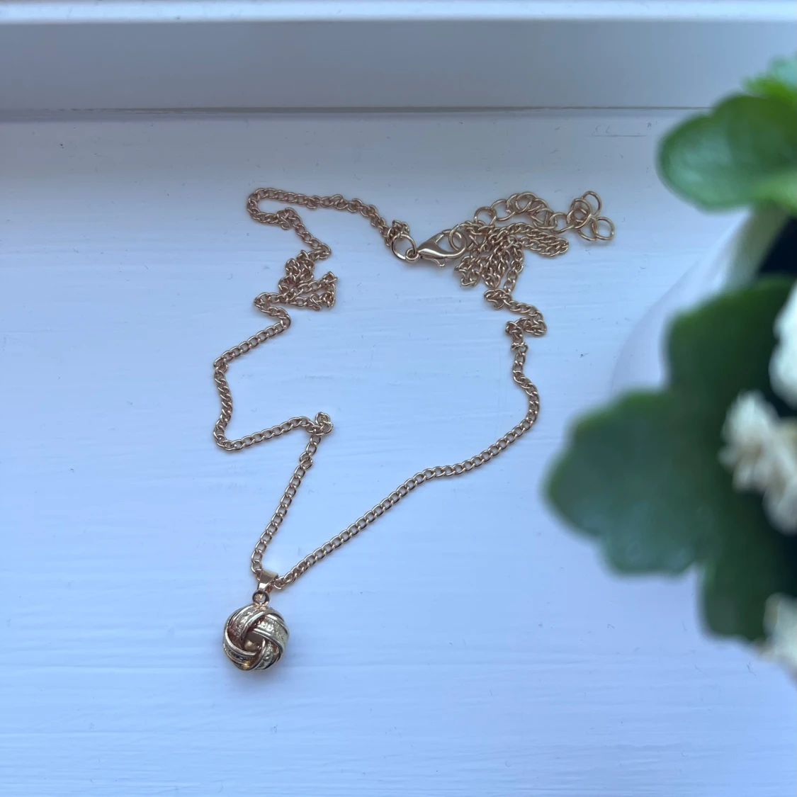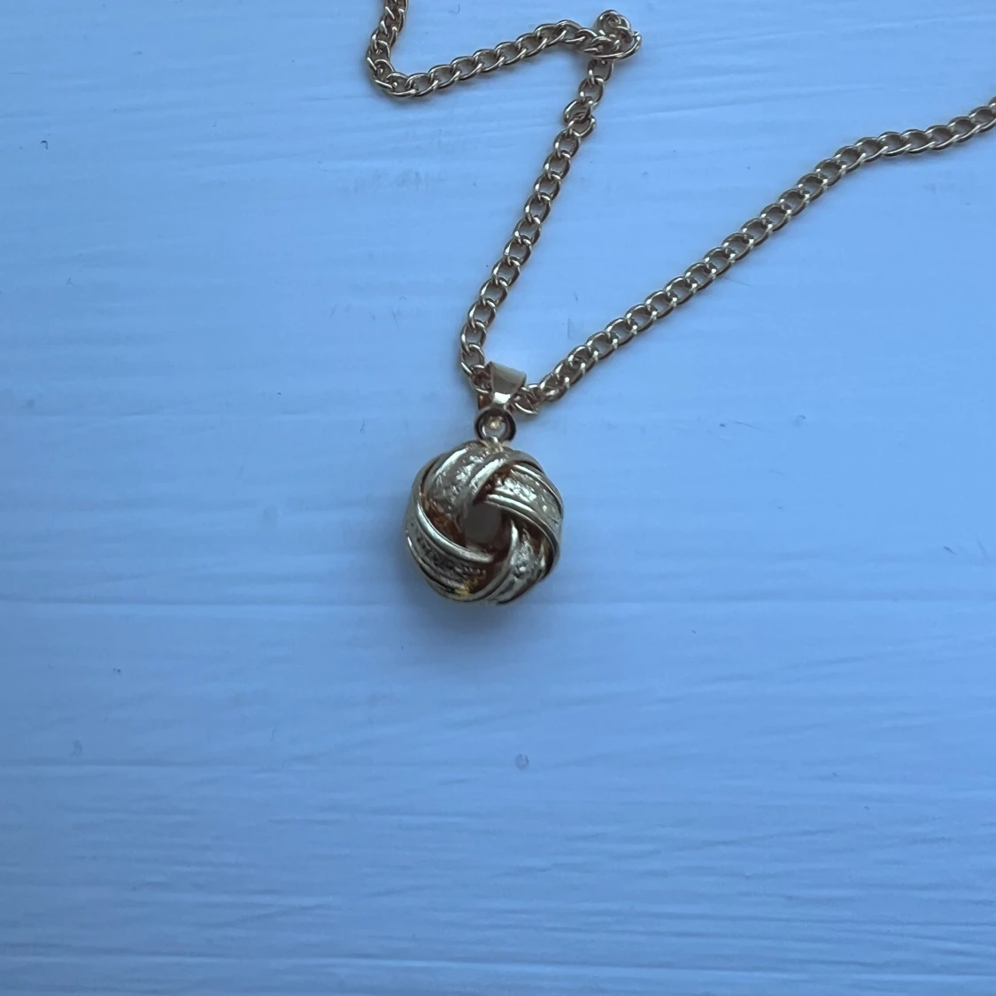 Elegant guldhalsband med en unik knutdesign som hänge. Kedjan är tunn och smidig, vilket gör den perfekt för att bära varje dag eller vid speciella tillfällen. Hänget har en intrikat flätad stil som ger en sofistikerad touch. Önskar du veta exakta mått? Tveka inte att höra av dig!