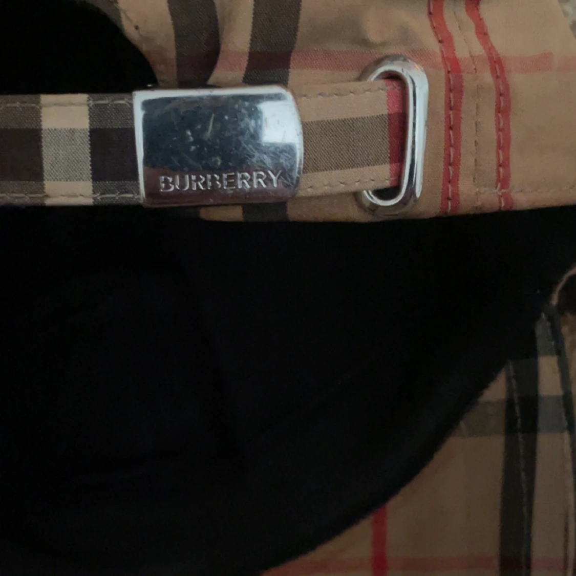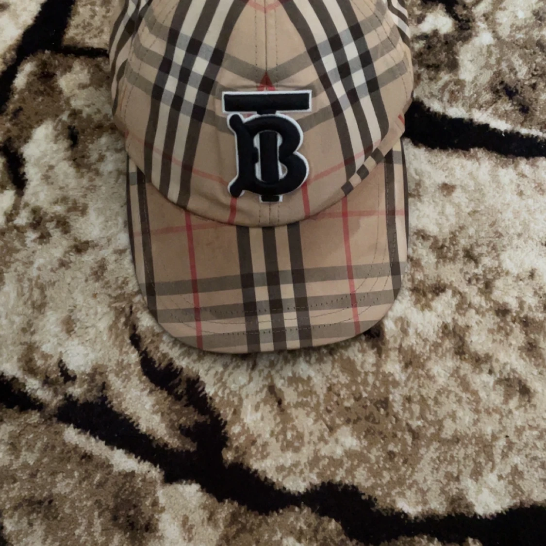 Snygg keps från Burberry i klassiskt beige, brunt och rött rutigt mönster. Framtill sitter en svart och vit TB-logga. Justerbar rem med metallspänne där Burberry är ingraverat. Tillverkad i 100% bomull, perfekt för dig som gillar lyxiga accessoarer. Köpt för 3800kr och är i bra skick.