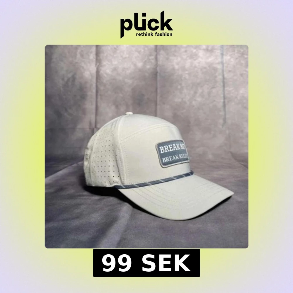 Ljusgrå keps med text 'BREAK 80? BREAK RULES!' - Snygg ljusgrå keps med böjd skärm och patch framtill med texten 'BREAK 80? BREAK RULES!'. Kepsen har perforerade sidor för extra ventilation och en dekorativ rand längs skärmens kant.