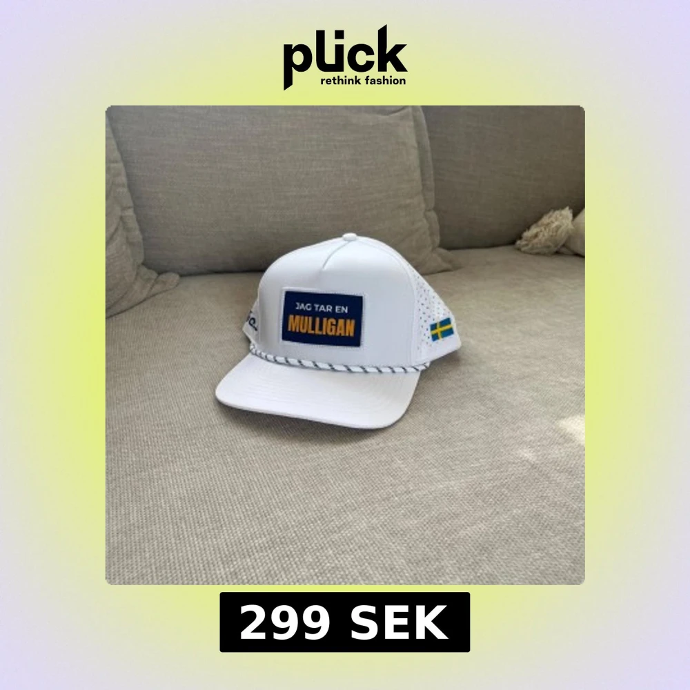 Vit keps med blå och gul patch där det står 'Jag tar en Mulligan'. Sidorna är perforerade för extra ventilation och ena sidan har en svensk flagga. Framtill finns en svartvit snodd som detalj. Justerbar baktill för perfekt passform.