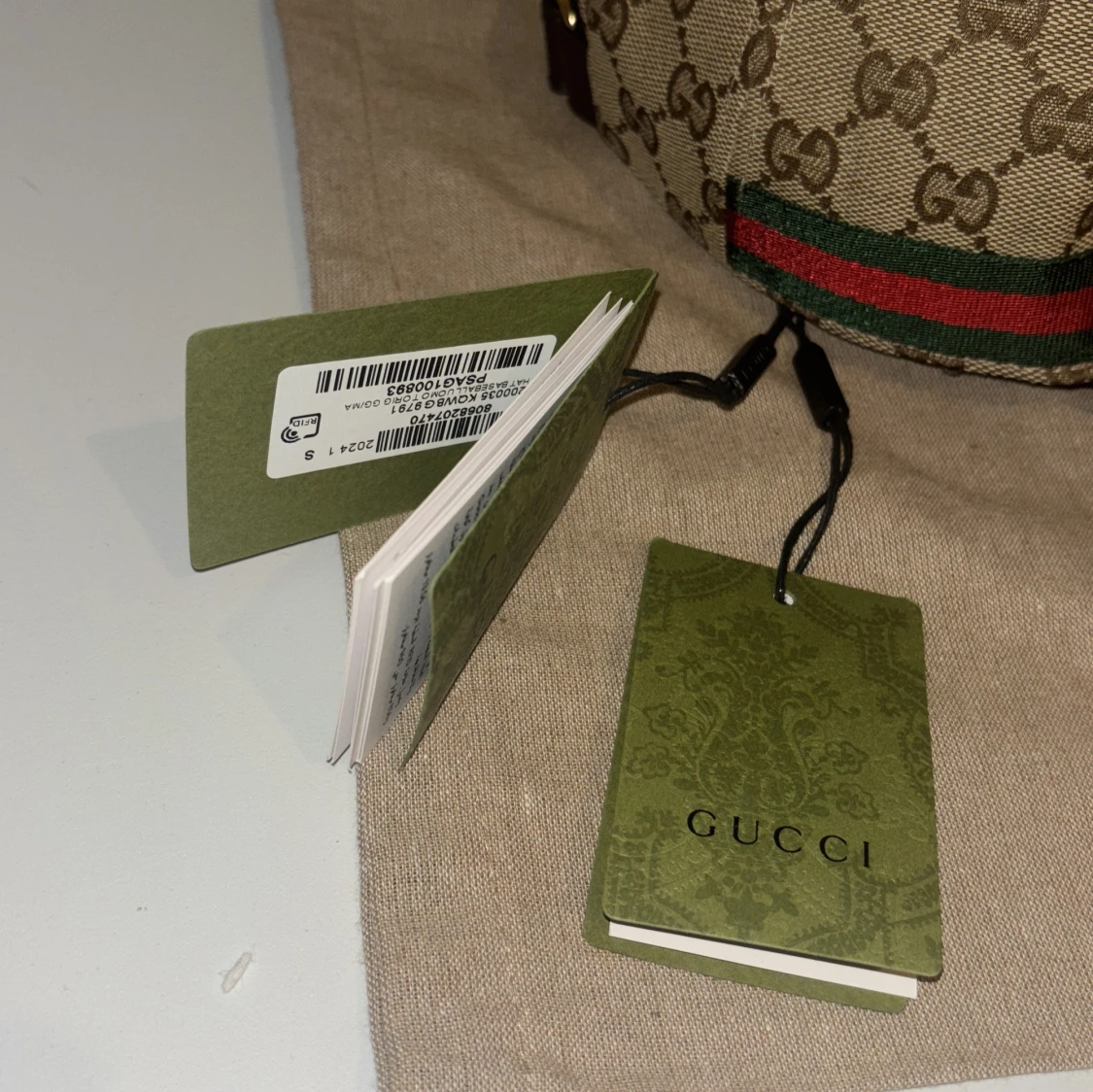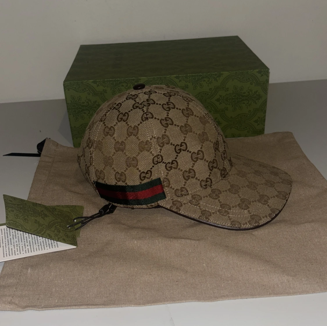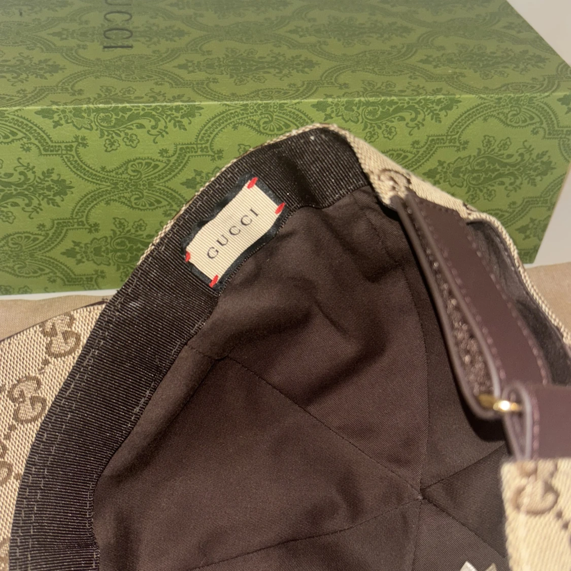 Snygg beige keps från Gucci med det ikoniska GG-mönstret. Kepsen har en justerbar rem med röd och grön rand på baksidan. Perfekt för att ge en lyxig touch till din outfit.