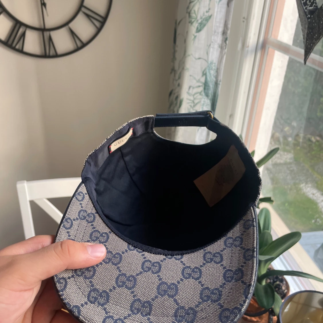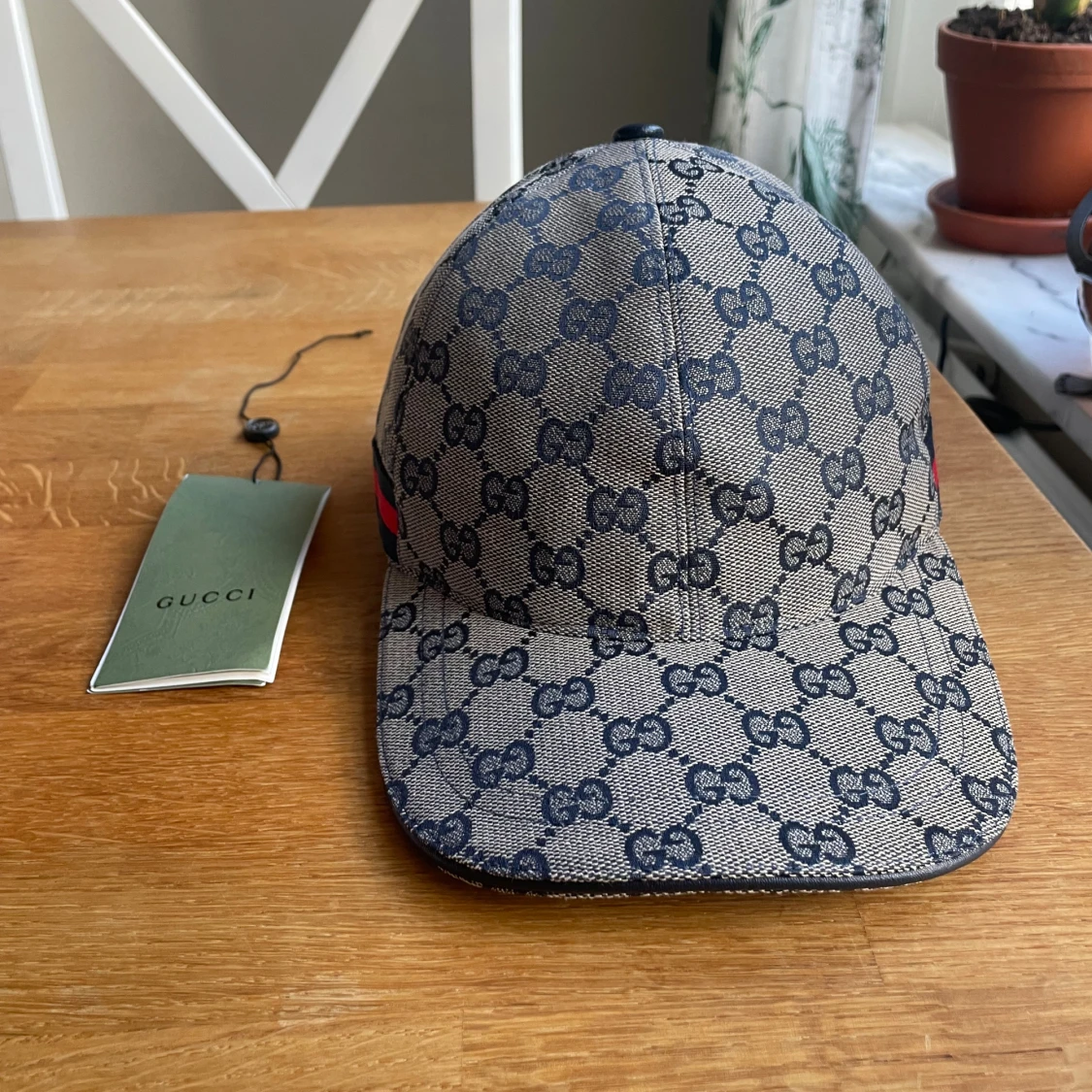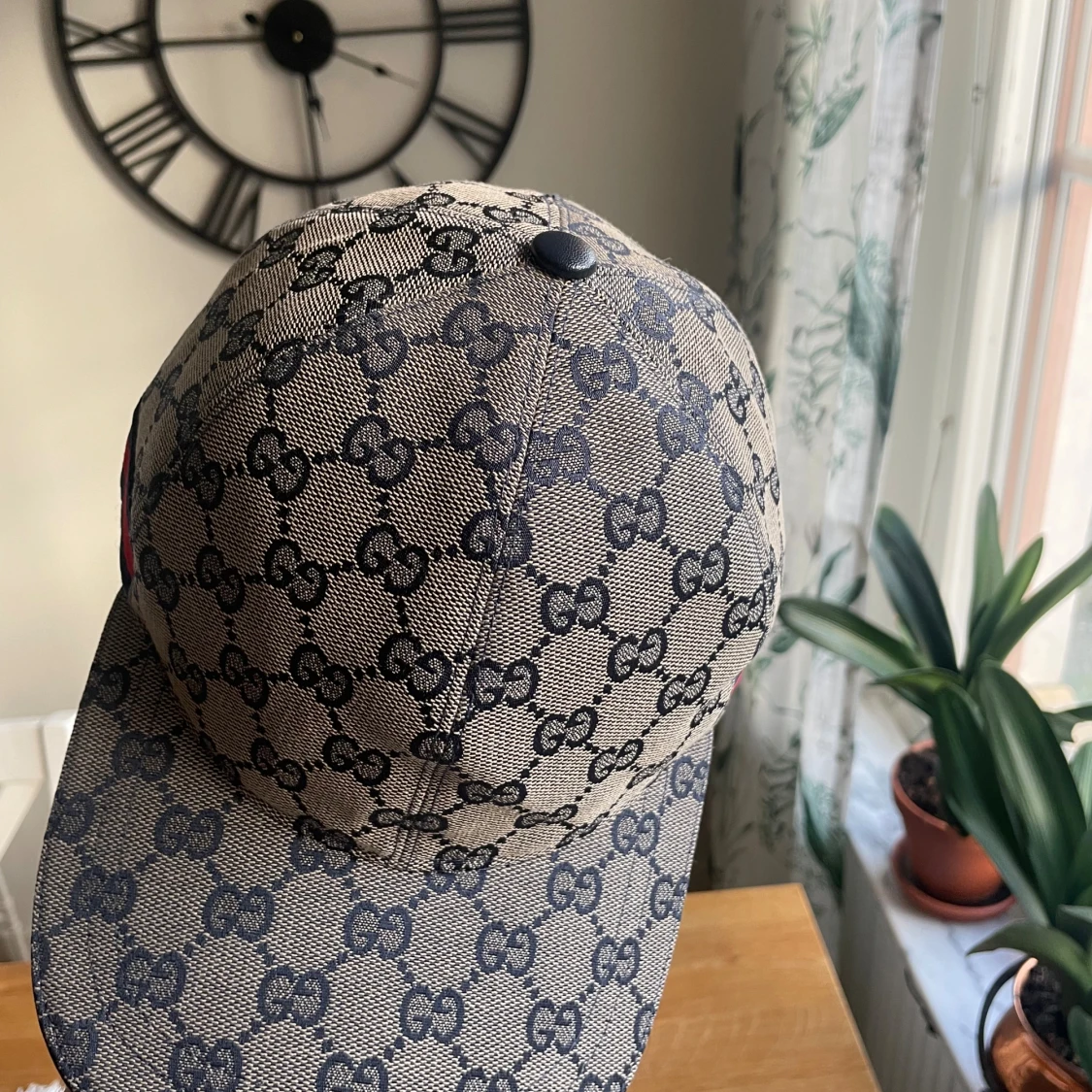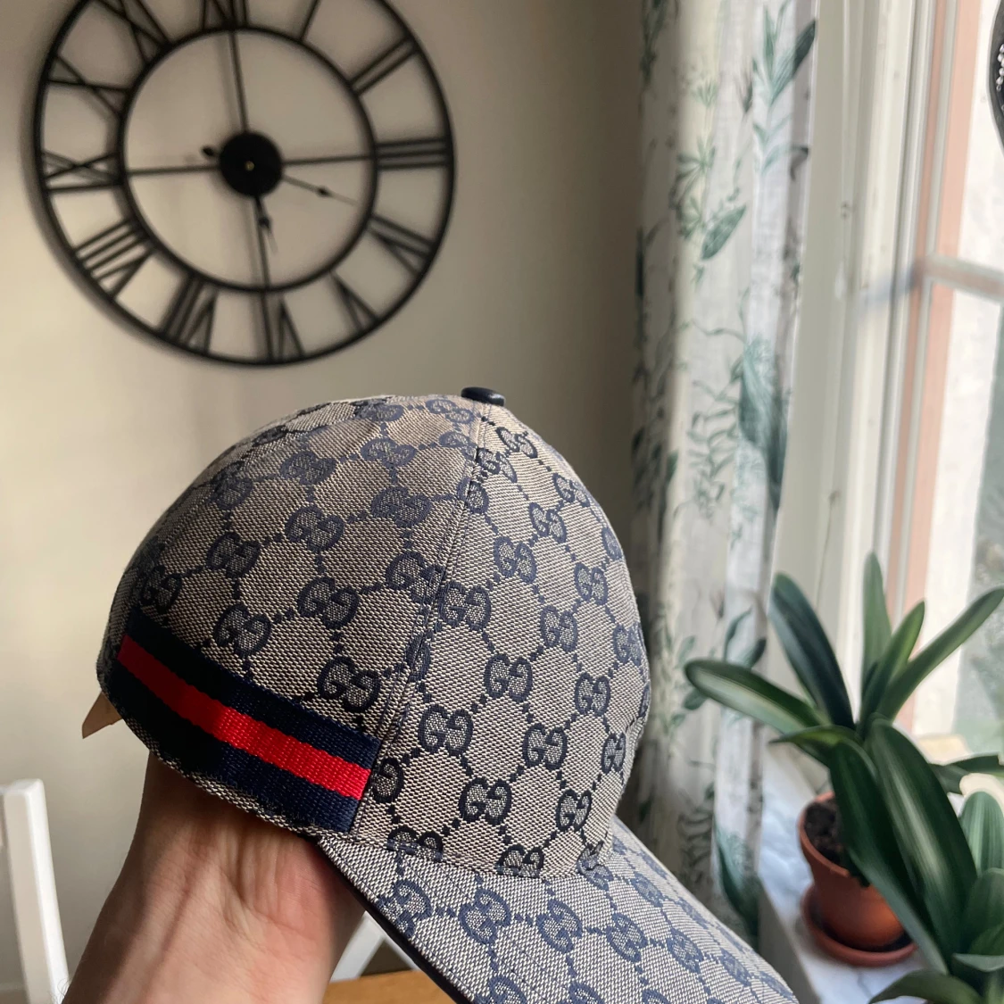 Säljer en snygg keps från Gucci med klassiskt GG-mönster i mörkblått på beige bakgrund. Helt oanvänd i storlek S. Skriv om du har minsta lilla fråga!