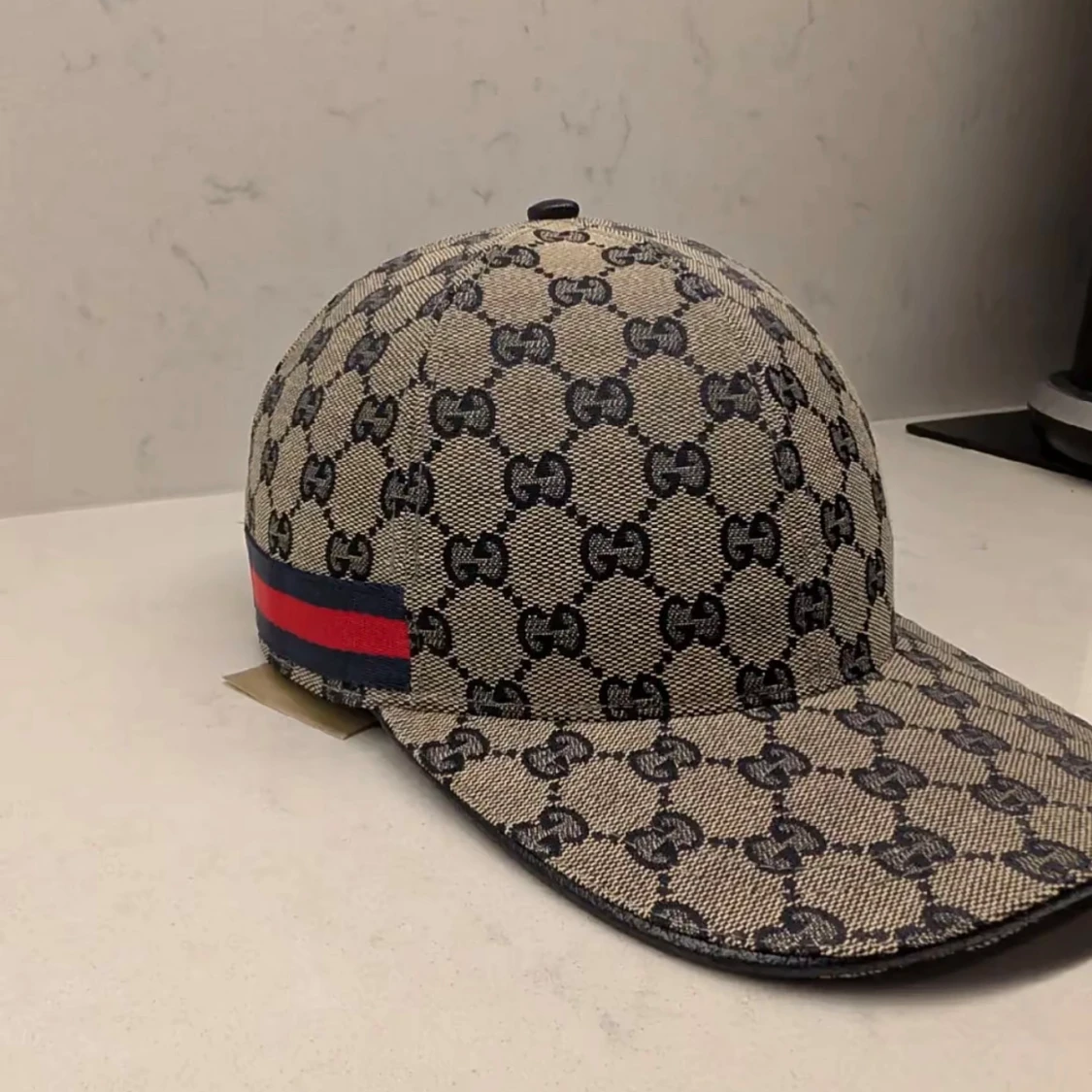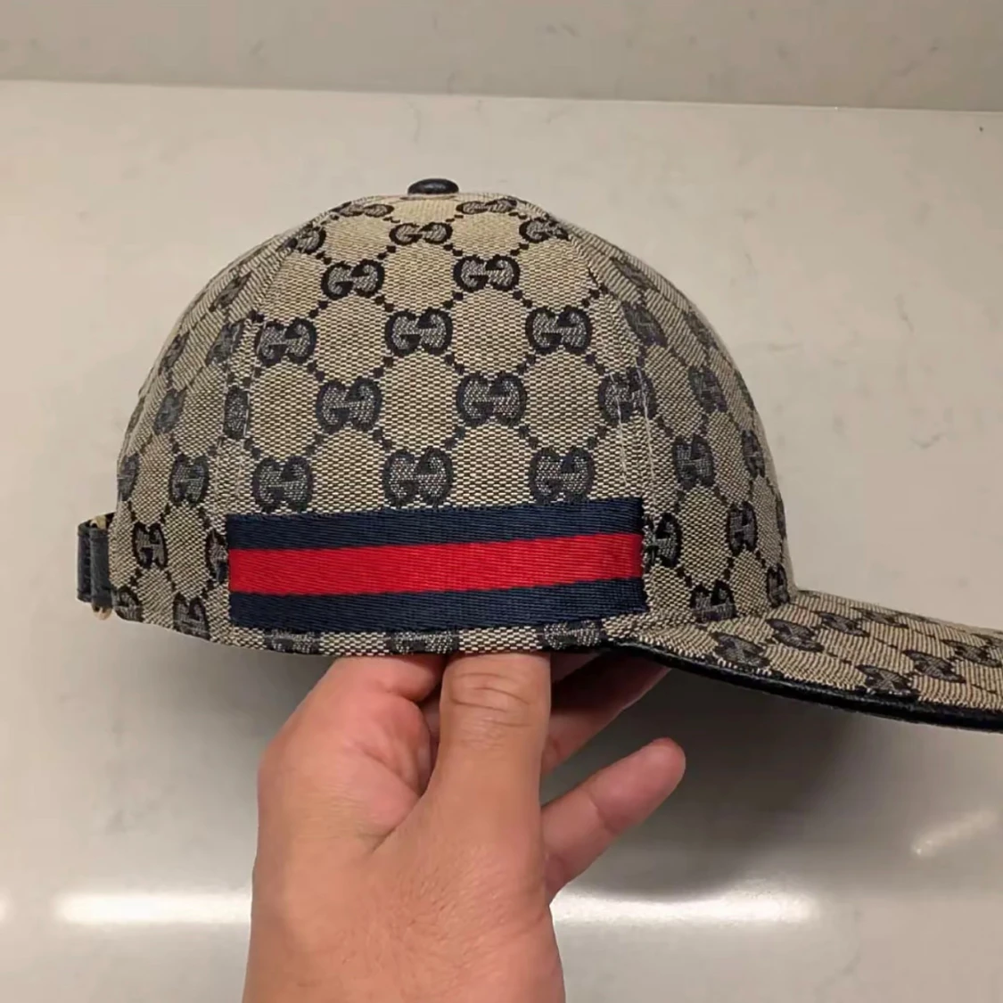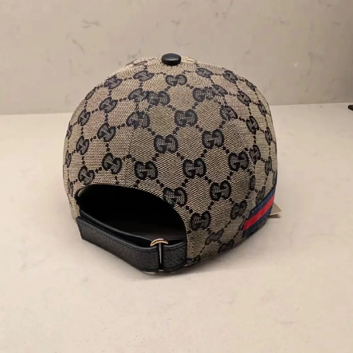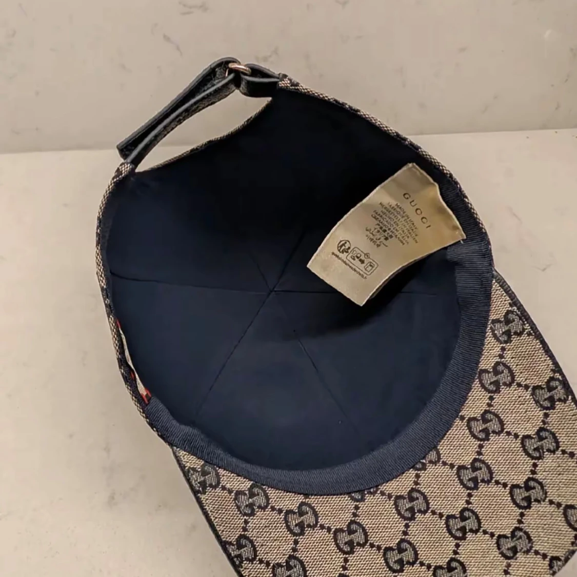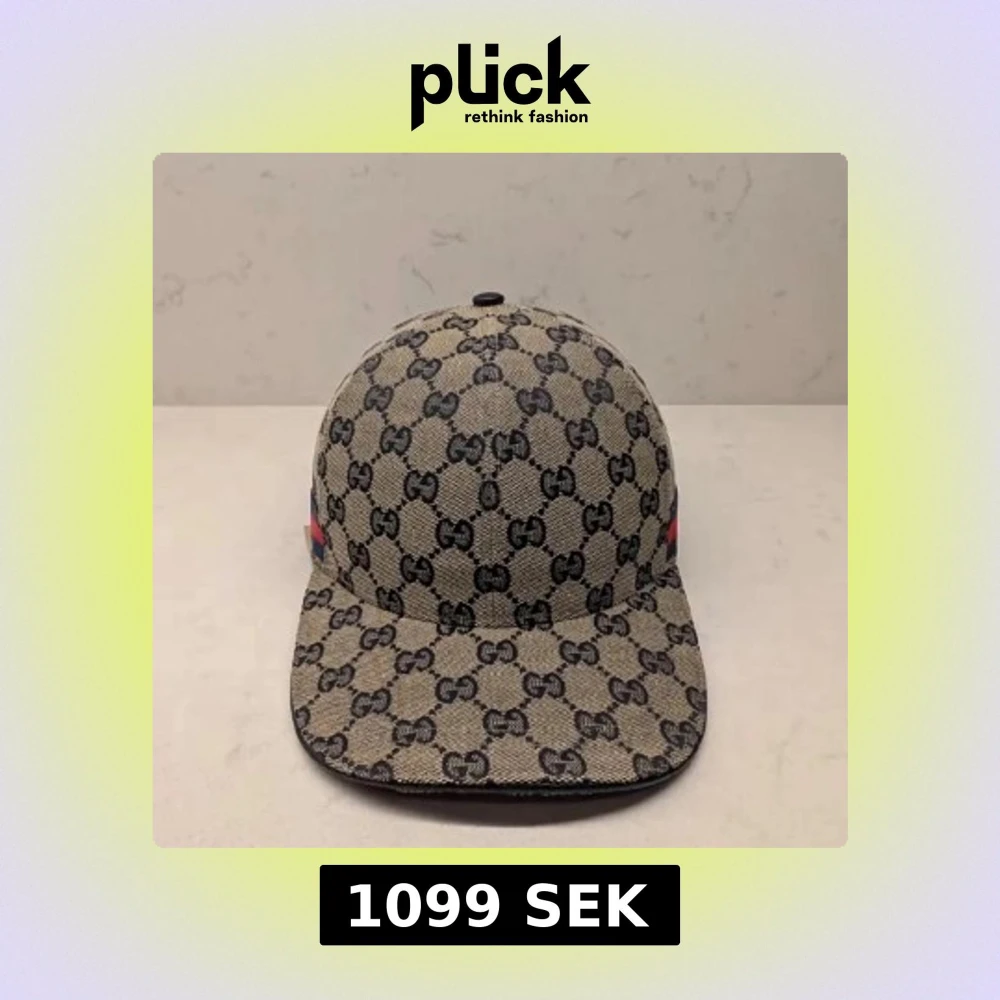 Snygg keps från Gucci med klassiskt GG-mönster i svart på beige bakgrund. Kepsen har en böjd skärm och justerbar rem bak i svart skinn. På sidan finns en röd och marinblå rand som ger extra lyxig känsla. Perfekt för dig som vill sticka ut med designerstil.