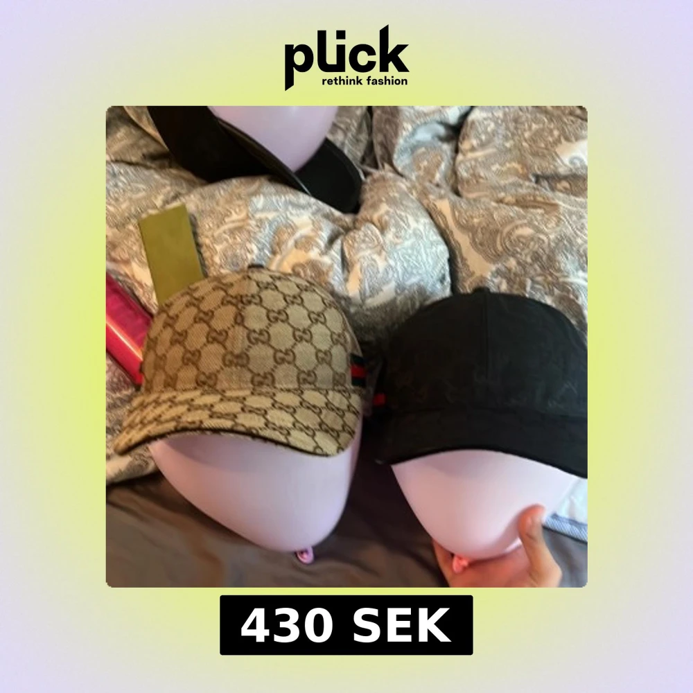 Två snygga kepsar – en i beige med klassiskt -mönster och en i svart med diskret -mönster. Båda har den ikoniska gröna och röda randen på sidan och justerbar rem bak. Perfekt accessoar för att lyfta din stil.