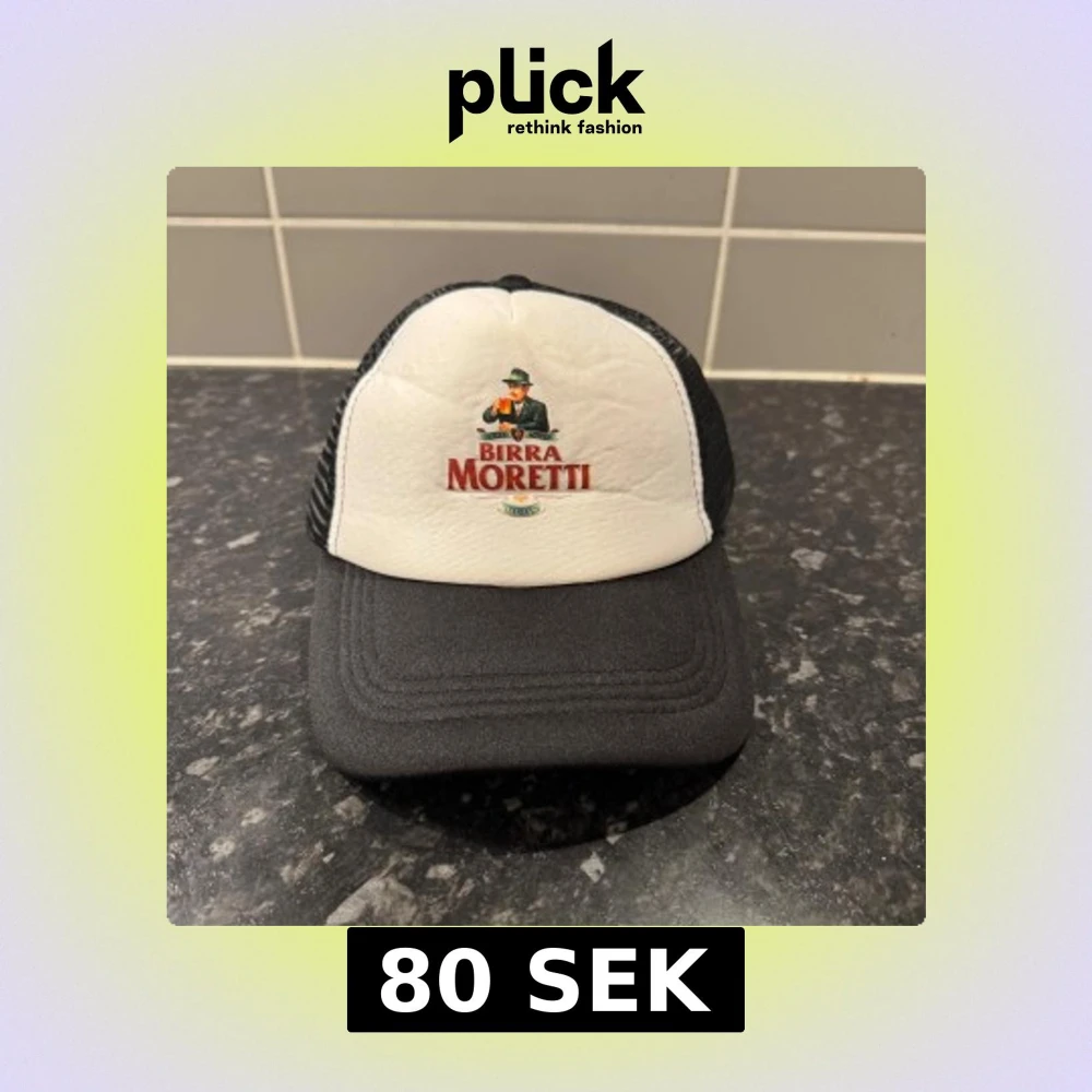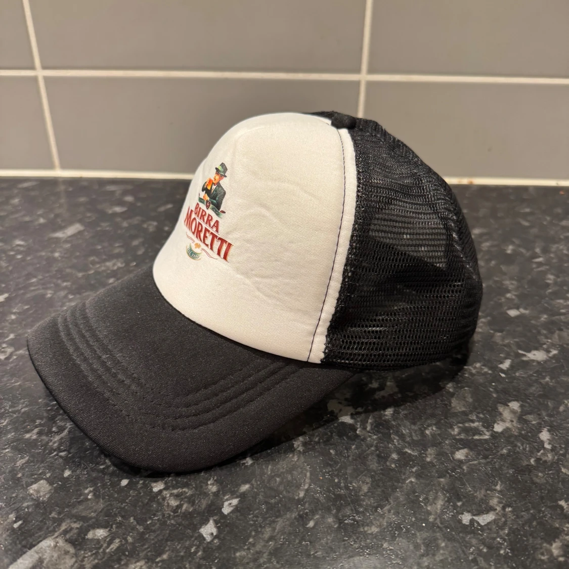 Snygg truckerkeps med svart skärm och mesh samt vit frontpanel med broderad Birra Moretti-logga. Klassisk böjd skärm och justerbar baksida. Perfekt statement-piece för dig som gillar streetwear och italiensk vibe.