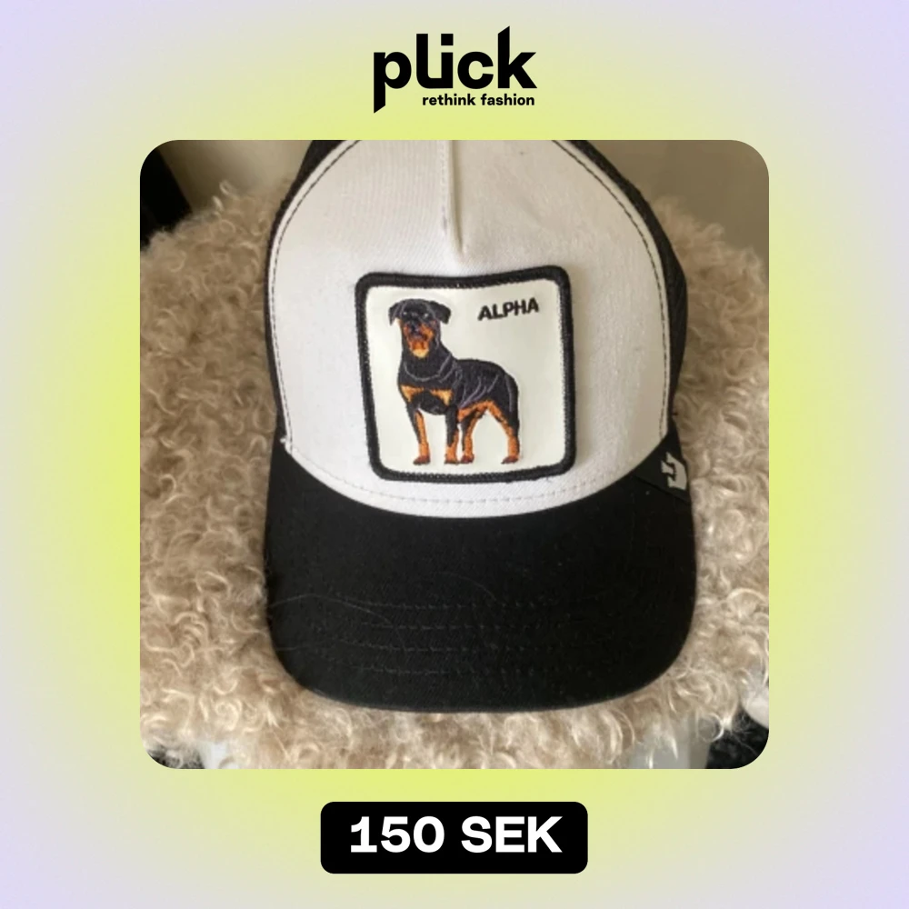 En The Farm keps med en text där det står ”Alpha”. Kepsen har också en bild på en hund.
