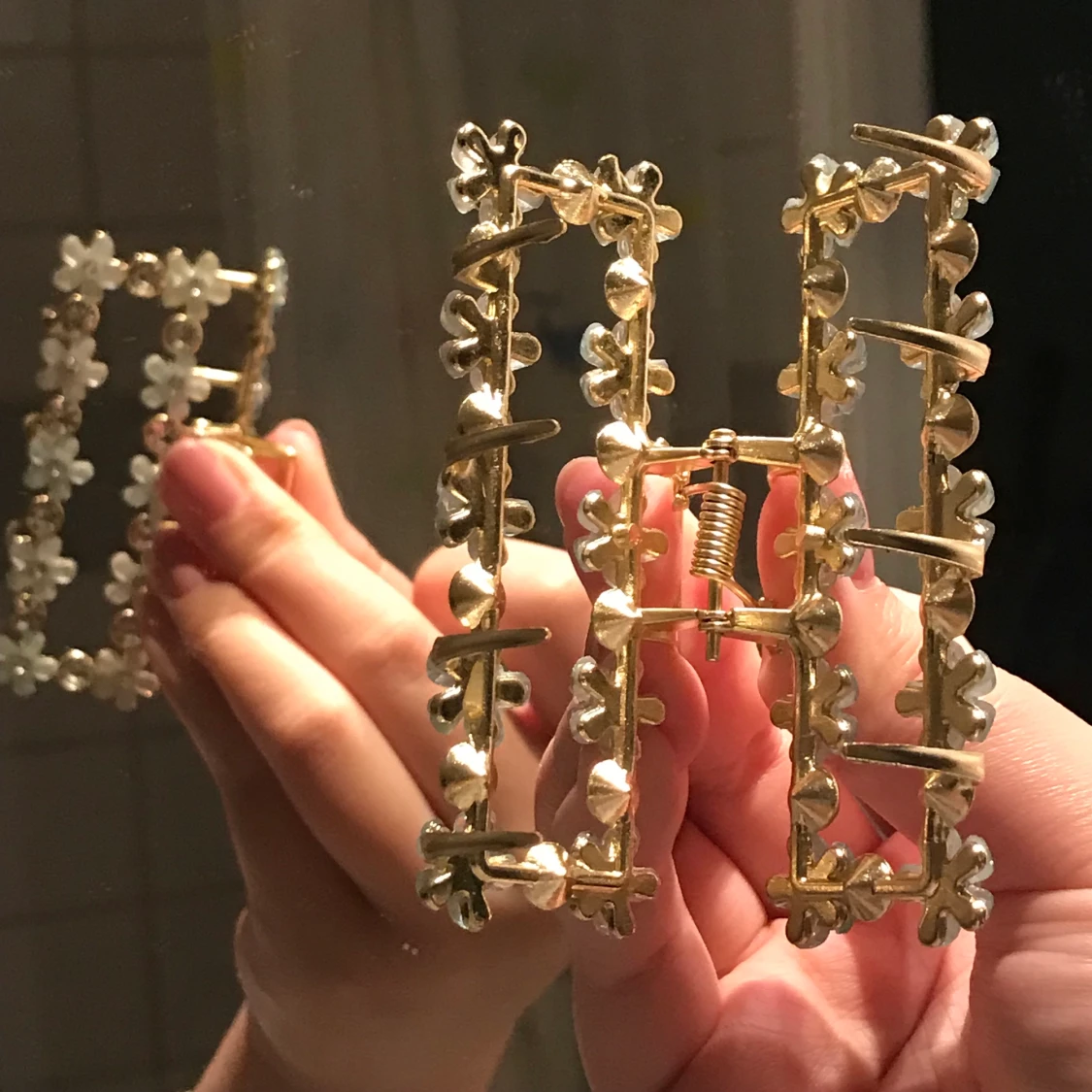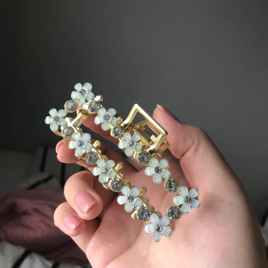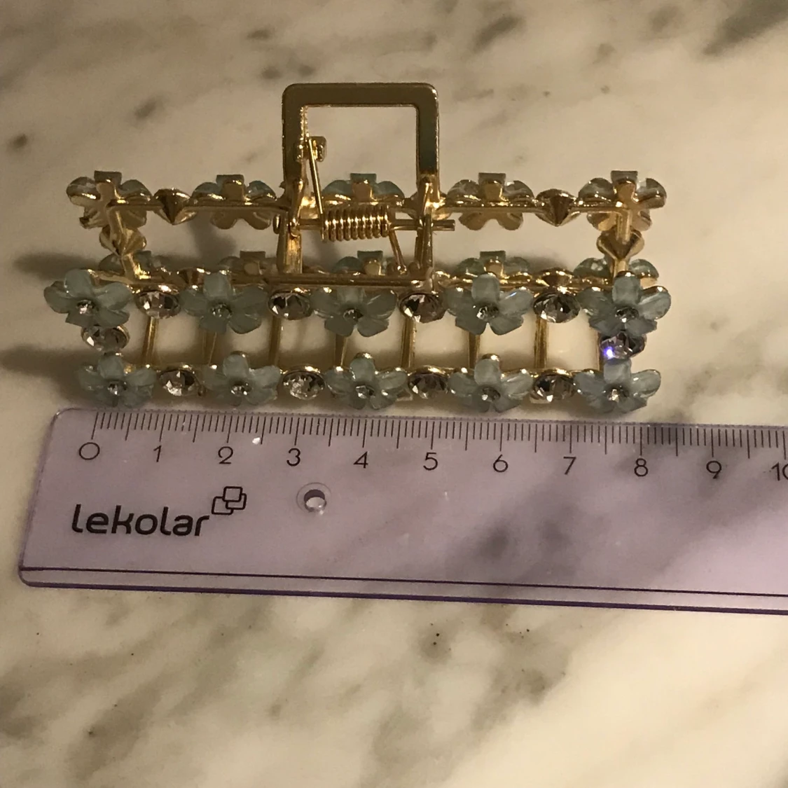 En metall klämma i guld färg. Jättesöt med stenar och ljusblåa blommor på sidan. Eftersom den är gjord i metall väger den lite mer än en vanlig hårklämma! Aldrig använd. Exklusive frakt