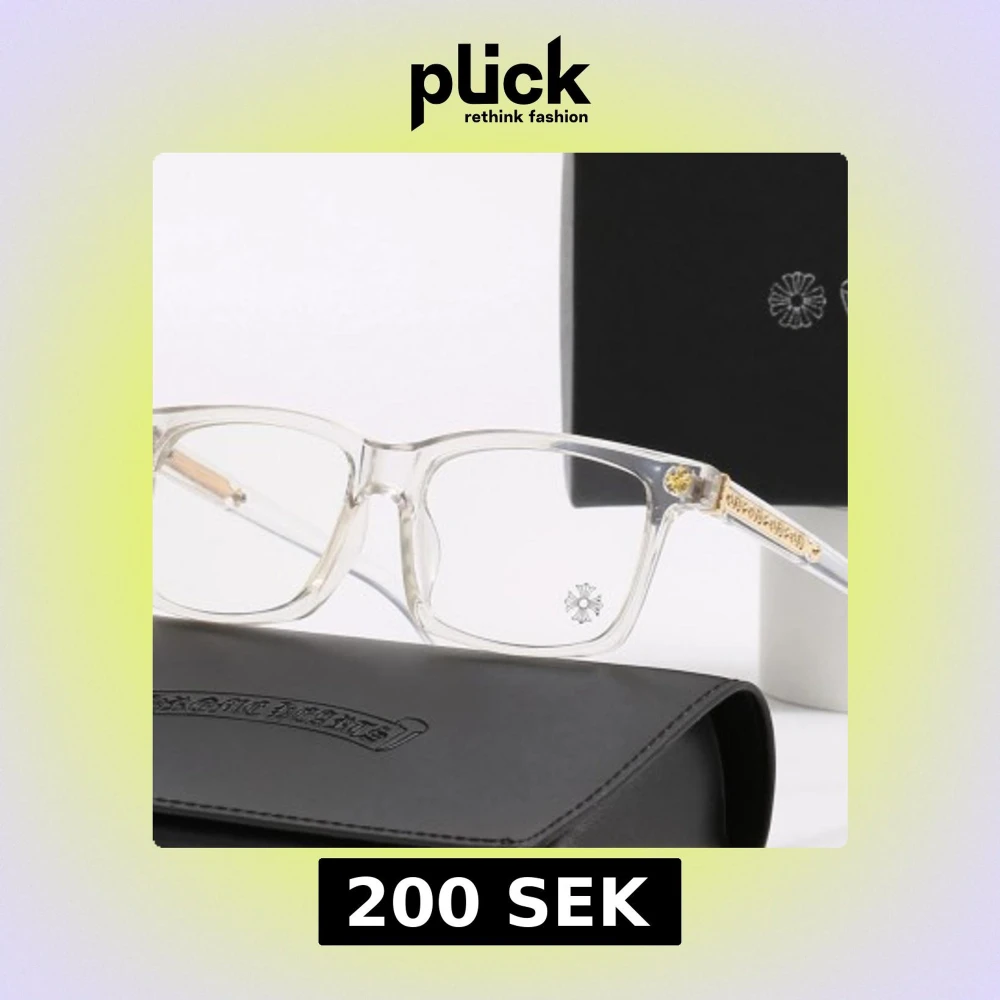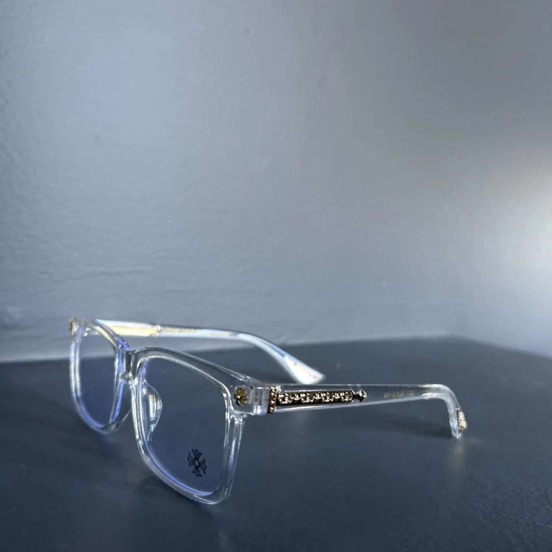 Stilrena glasögon från Chrome Hearts med transparent fyrkantig båge och guldiga detaljer på skalmarna. Snygg logga på glaset och exklusiva metallinslag vid gångjärnen. Perfekt för dig som vill sticka ut med en lyxig och modern look. ( ingen låda kommer med)