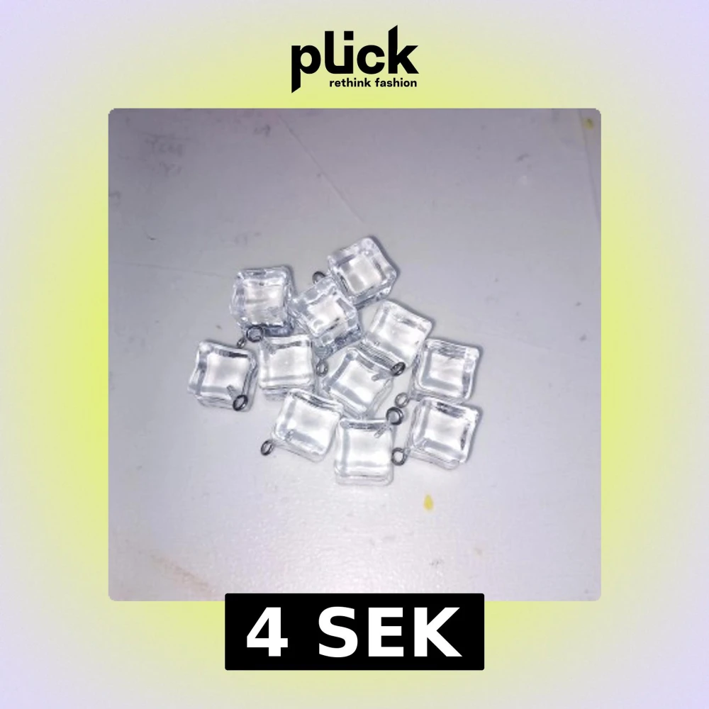 Säljer flera små berlocker i form av klara isbitar, perfekta att använda till att göra egna smycken som halsband eller armband. De är fyrkantiga och har en liten ögla i metall för enkel fastsättning.