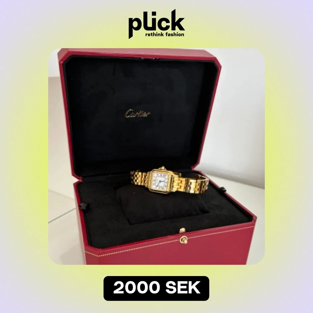 Guldklocka i guldpläterad, modellen Panthére Small. All tillbehör medföljer med ( box, påse, böcker mm ), nypris för en äkta 290 tusen. Pris går att diskuteras vid snabbaffär!