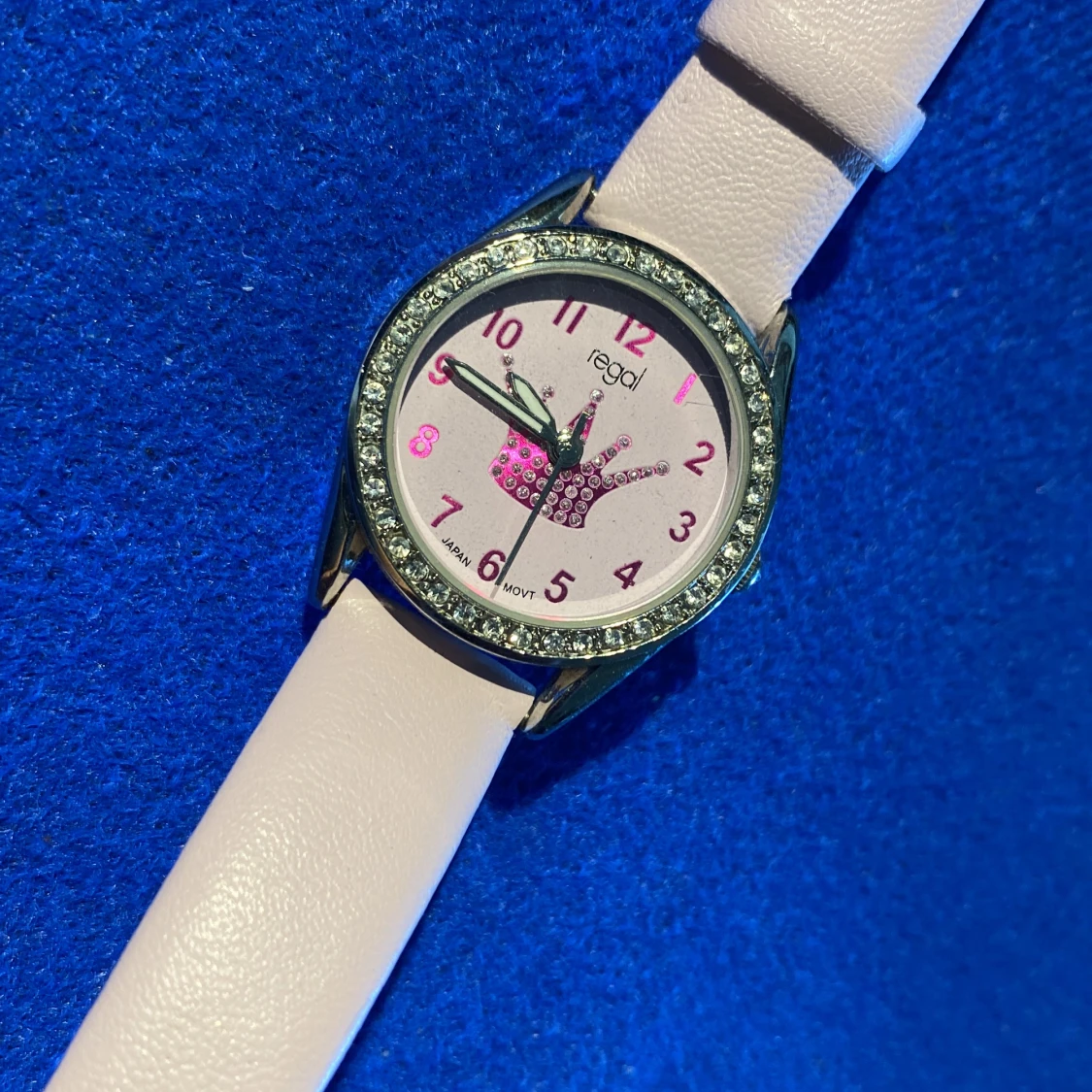 Rosa armbandsur med blingad prinsesskrona på urtavlan. Behöver nytt batteri.