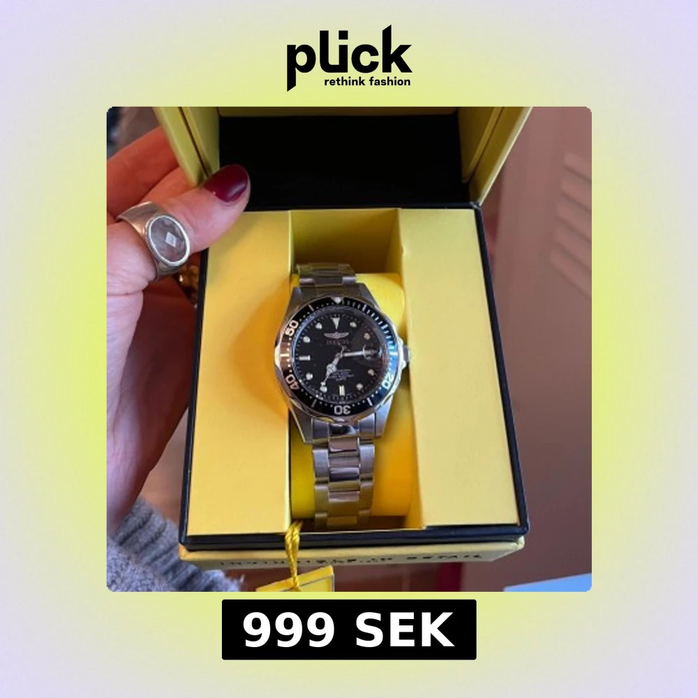Snygg och stilren silver klocka från Invicta med svart urtavla och tydliga markeringar. Klockan har en robust metallarmband och en vridbar bezel. Perfekt för den som gillar en klassisk look. Vättentät.