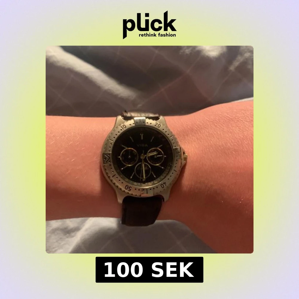 Stilren klocka från Visa med svart urtavla, silverfärgad boett och brunt läderarmband. Urtavlan har flera små visare och detaljer i guld. Boetten är i rostfritt stål och armbandet har klassiskt spänne.