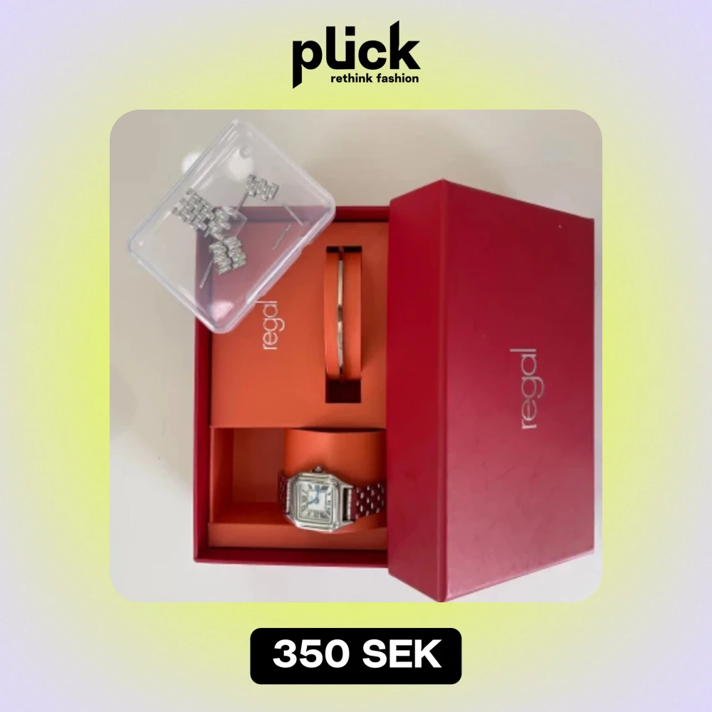 klocka från regal (ur&penn). Har har anpassat klockan efter min handledsstorlek men resterande delarna finns kvar. Man kan även anpassa storleken hos ur&penn gratis( läs på hemsidan). aldrig blivit utsatt för vatten. Stainless.Originalpris: 599kr