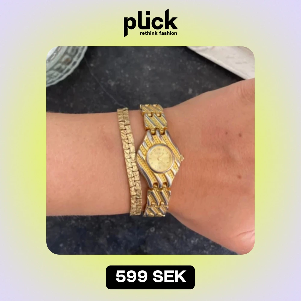 Använder aldrig klockan, därav sälja den! Klockan ej går, går säkert att fixa men har aldrig testat. 18k guld elektropläterad klocka med rostfrittstål baksida