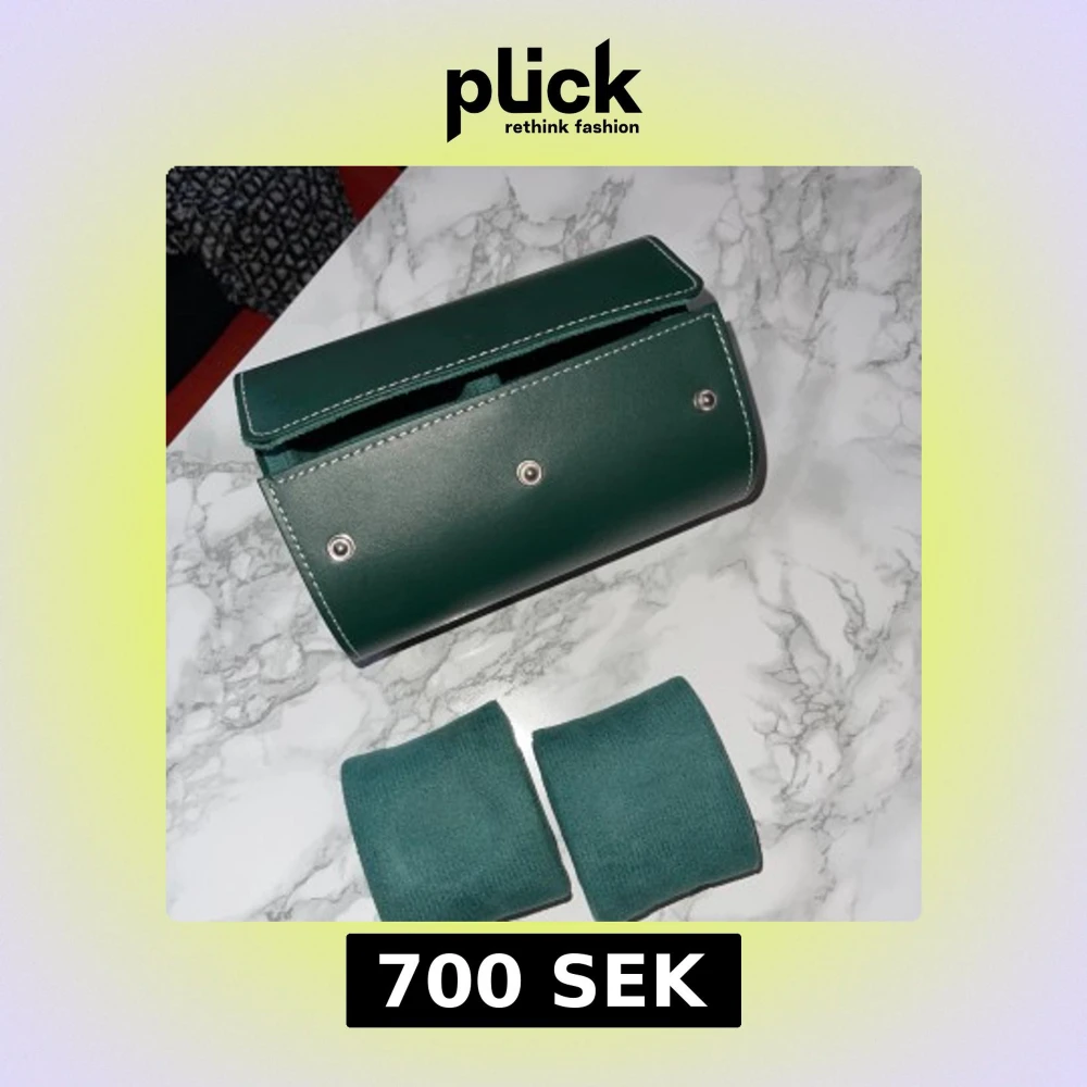 Snygg klocklåda i mörkgrönt skinn med silverfärgade knappar och vit kontrastsöm. Insidan är klädd i mjukt grönt tyg och har två matchande kuddar som kan användas för att skydda dina klockor. Perfekt för dig som gillar unika accessoarer.
