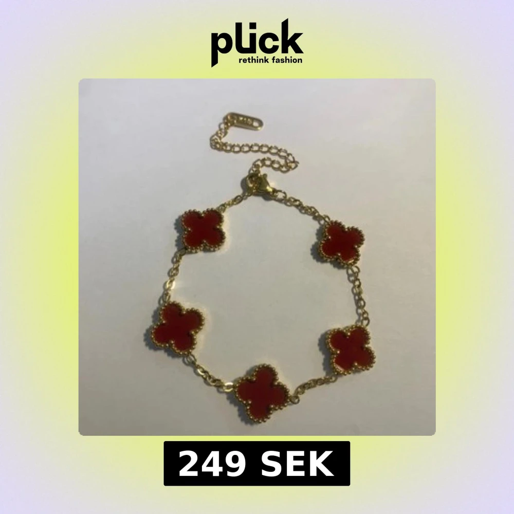 Elegant guldarmband med fem fyrklöverformade länkar. Trycket är detsamma på båda sidorna. Helt oanvänd, köpt utomlands. Materialet är rostfritt stål med 18K guldplätering. Armbandet har lite skador på två av klövern på ena sidan, kan skicka bild vid intresse samt gå ner i pris för just denna armband. Har även andra klöver smycken, i andra färger. Skriv vid intresse