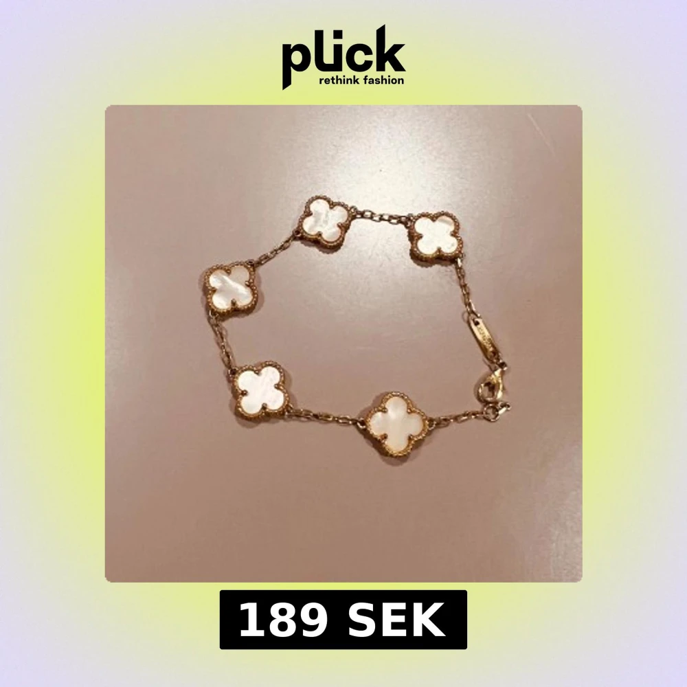 Exklusivt armband med fem fyrklöverformade länkar i vit pärlemor och guldfärgad kedja. Ikonisk design.