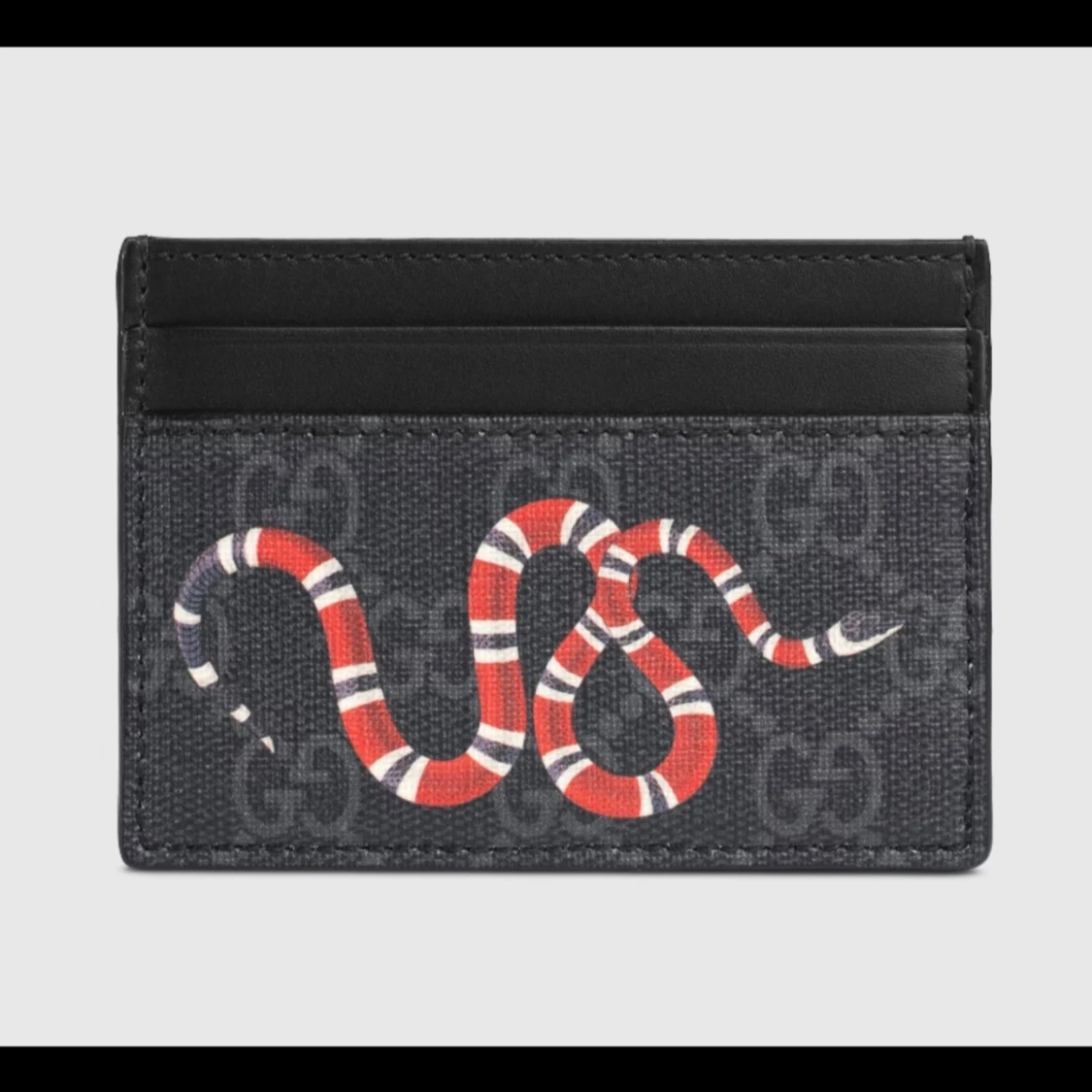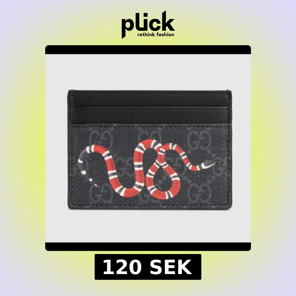 Snygg korthållare i svart med diskret GG-mönster och en röd-vit orm på framsidan. Tillverkad i slitstarkt skinn och canvas, perfekt för dig som vill ha något unikt och stilrent i fickan.