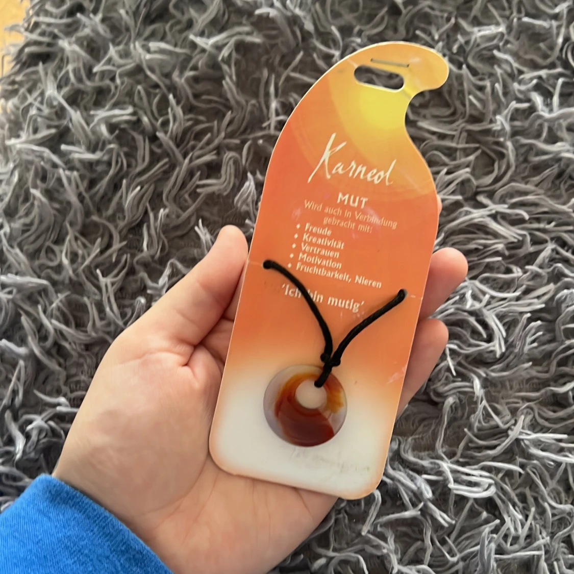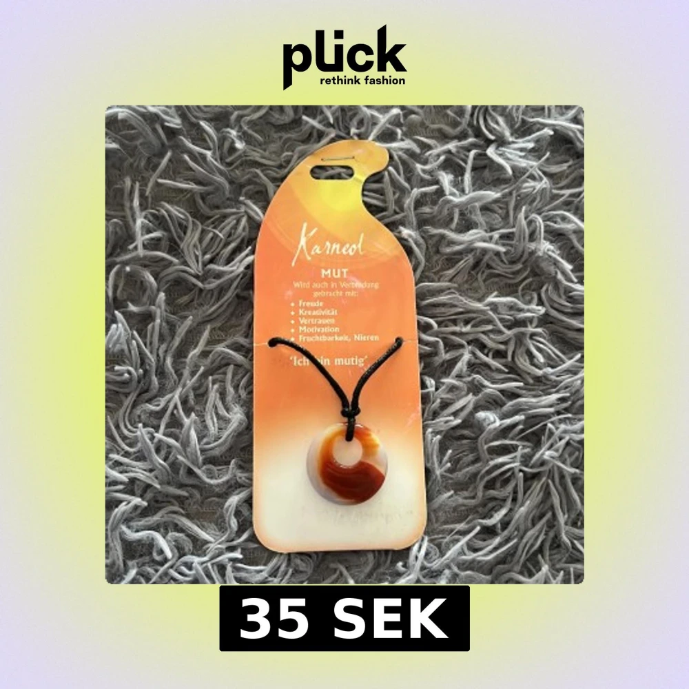 Unikt halsband med rund kristall i varma toner av rödbrunt, orange och vitt. Hängs i ett svart snöre som enkelt kan justeras. Stenen har naturliga mönster och ger en cool, bohemisk vibe. Perfekt accessoar för dig som gillar kristaller och personlig stil.