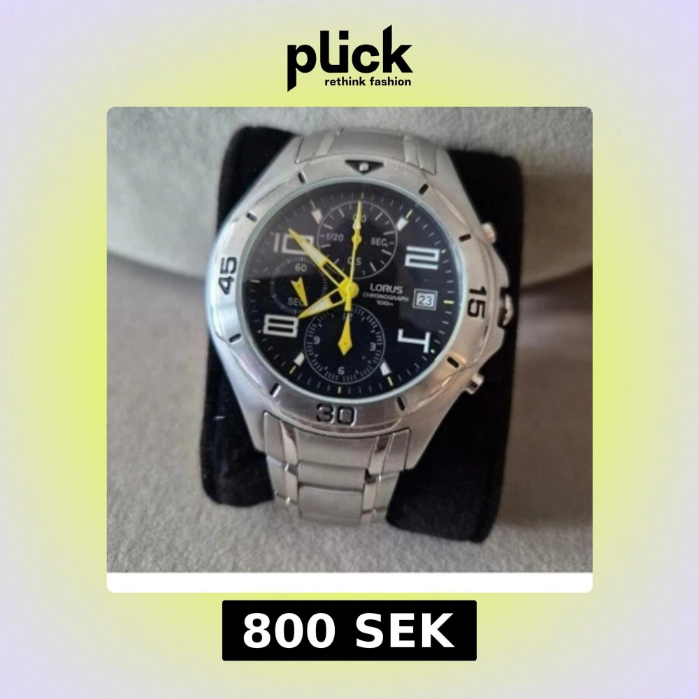 Snygg silverfärgad kronografklocka från Lorus med svart urtavla och gula detaljer. Nypris cirka 1800:- Klockan har en datumvisare och tre subdials för tidtagning. Armbandet är i rostfritt stål med en säkerhetslåsning. Perfekt för den som gillar en sportig och stilren look.