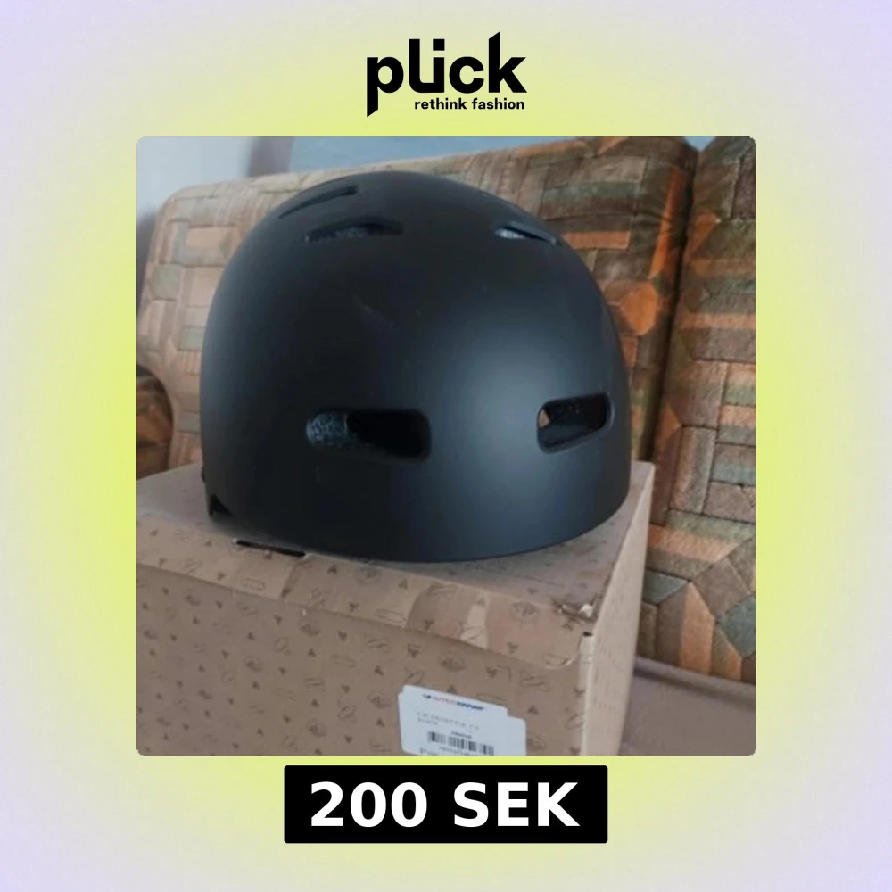 Säljer en stilren svart hjälm med matt finish och flera ventilationshål. Perfekt för cykling, skateboard eller annan träning. Sitter bekvämt på huvudet och har en enkel, modern design.