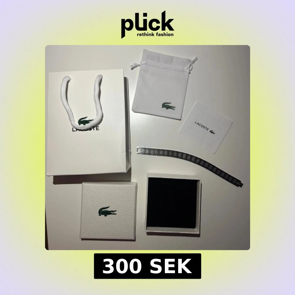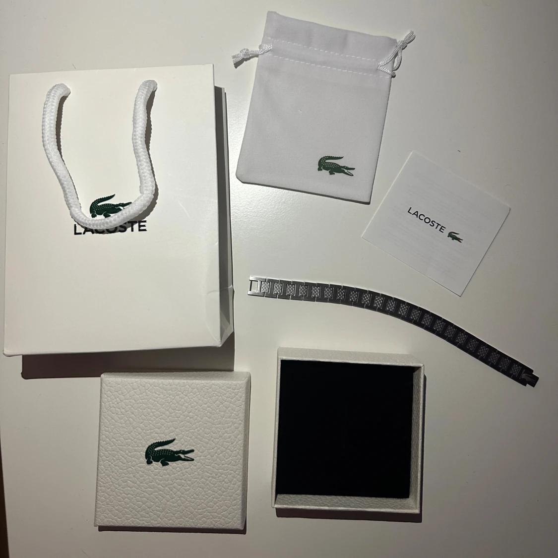 Stilrent armband i silverfärgad metall från Lacoste med klassisk krokodillogga på låset. Länkarna har ett snyggt mönster som ger extra edge. Levereras med originalförpackning, tygpåse och äkthetsbevis. Perfekt accessoar för dig som gillar sportig och modern stil.