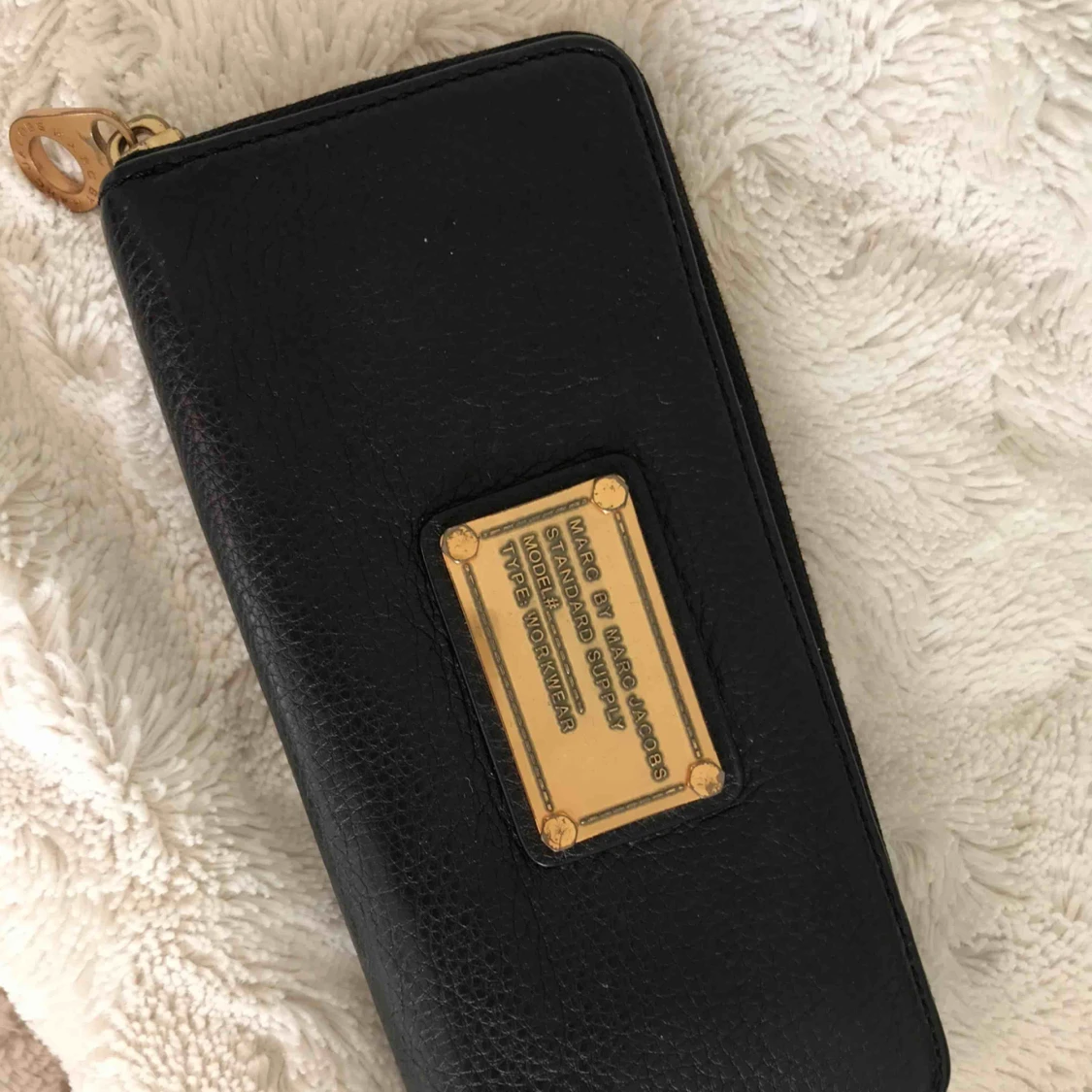 Marc Jacobs plånbok i svart med gulddetaljer. Naturliga slitningar på gulddetaljerna på märket. Använd fåtal gånger. Inköpt för 2199kr på Raglady i Göteborg FRI FRAKT!