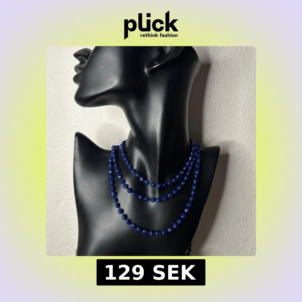 Långt retrohalsband från 70-talet, inropat på auktion med äldre bijouterier. Halsbandet är ca 130 cm långt och kan bäras enkelt, dubbelt eller trippelt för olika uttryck. De oregelbundet formade pärlorna i intensiv koboltblå färg har en blank glans som ger halsbandet ett elegant men ändå lekfullt utseende. Materialet är akryl/plast, typiskt för epoken, och gör smycket lätt och bekvämt att bära. Jag prutar inte men erbjuder rabatt vid köp av flera saker.