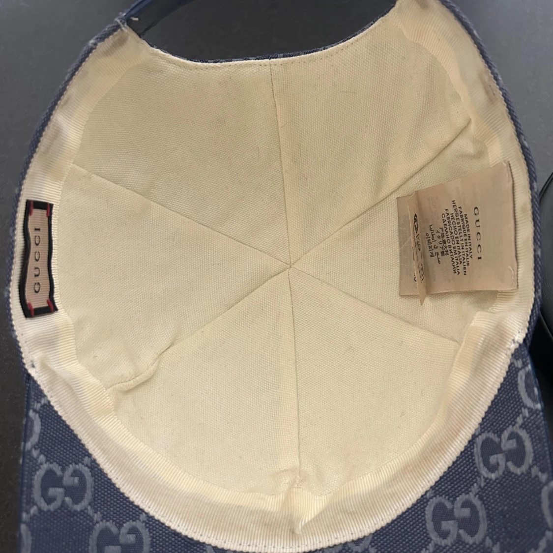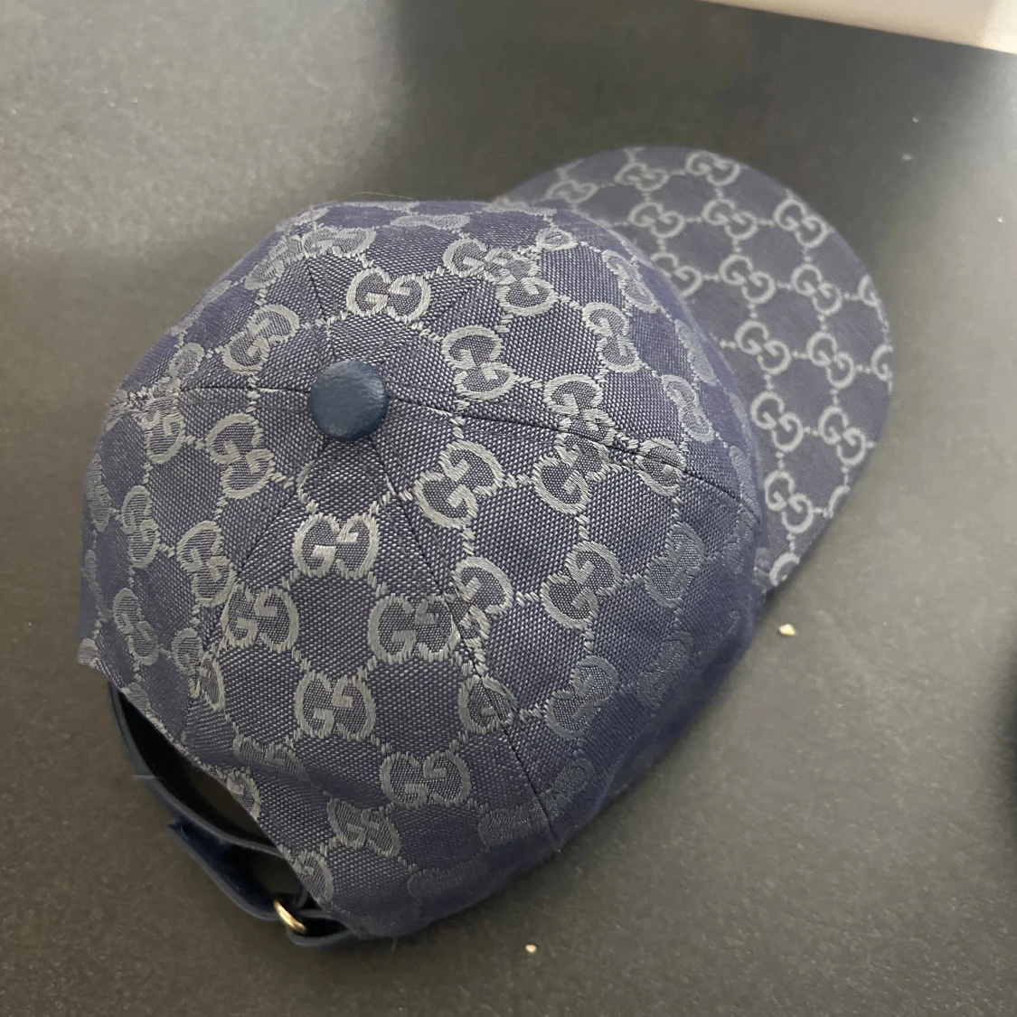 Säljer en blå keps från Gucci med ikoniskt GG-mönster över hela kepsen. Kepsen är tillverkad i bomull och har justerbar rem baktill. Snygg och stilren accessoar för dig som vill sticka ut med lyxig streetstyle.