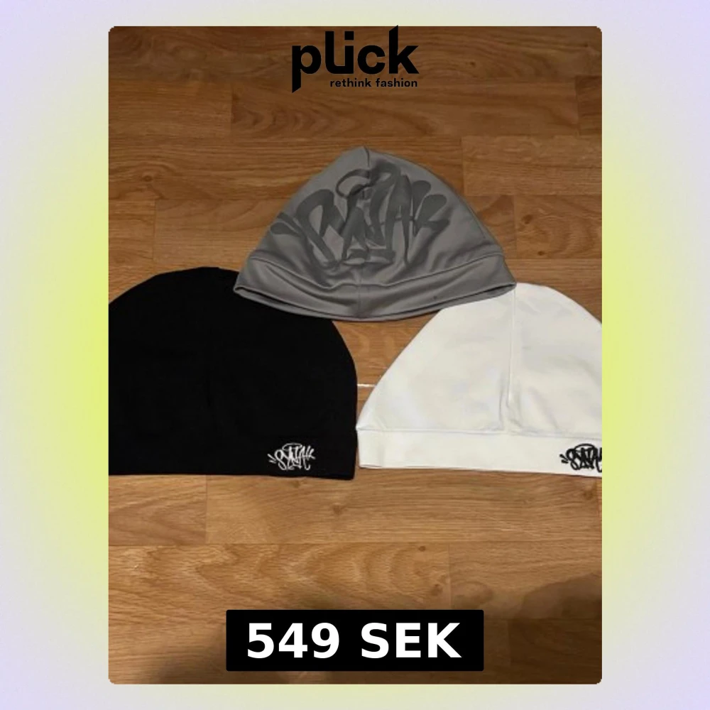 Säljer tre mössor från Syna World i svart, vitt och grått. Alla har ett coolt streetstyle-inspirerat tryck framtill. Mössorna är mjuka och stretchiga, perfekta för dig som gillar enkel men snygg stil. Passar både till chill och mer urban look.